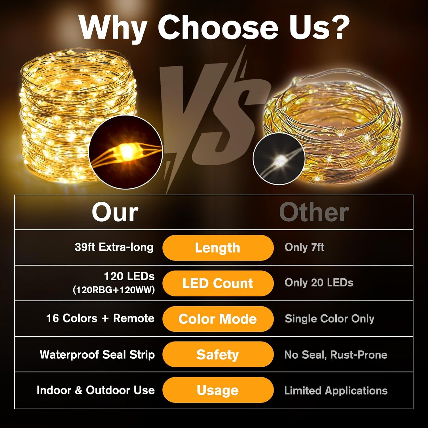 - 【39Ft, 120 Led, 16 Vibrant colors】Compared to other single color fairy lights on the market, we made it 39 ft with 120 Leds, 16 colors, which is more useful and cost-effective. Use the remote control or press the button on the battery case to switch different colors like warm white, red, green, blue, orange, purple etc to create ideal ambience in special events and occasions. LED Bulb Size: 8.55mm*5.0mm