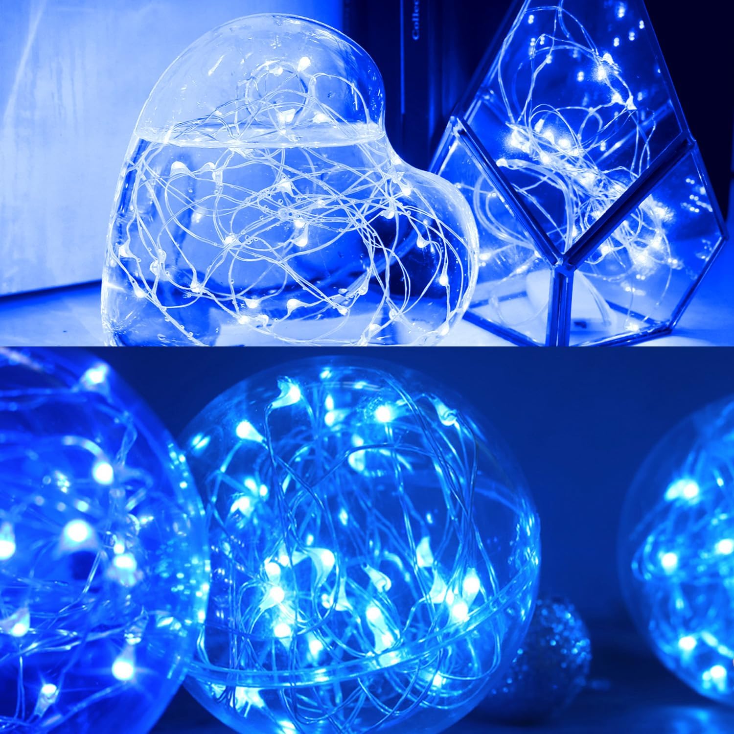 - Battery Operated Fairy Lights:6pcs lights per packing,battery compartment extension cord is 0.6ft,each light is with 6.25 feet flexible thin silver copper wire with 20pcs bright micro leds,Blue Lighting. They glint in the dark, decorate your patio, deck, front porch, bedroom,wedding, party, shop, restaurant ,room and Thanksgiving,Christmas Centerpiece Decor , And the copper wire disappeared into the night, Leaving only light.
