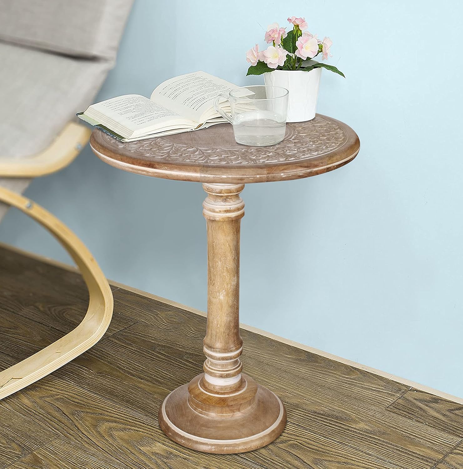 Lightnpro Carved Round End Table with Single Pillar - Handcrafted Accent Bedside Nightstand Side End Table for Living Room, Entryway, Vintage Desk for Books, Plants & Décor - 18x22 Inch - White Wash