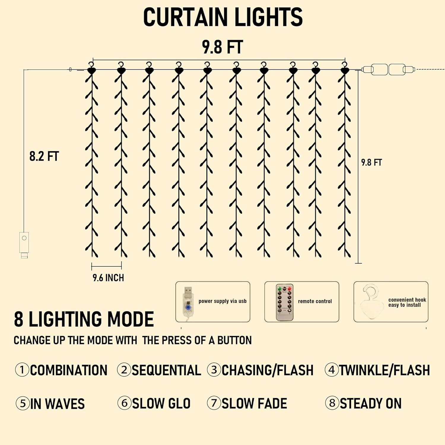 - 8 modes setting: Funpeny LED curtain string lights has 8 lighting modes(Combination, In waves, Sequential, Slow Glow, Chasing/Flash, Slow fade, Twinkle/Flash, Steady on). Beautiful and practical, multiple functions can meet your needs.