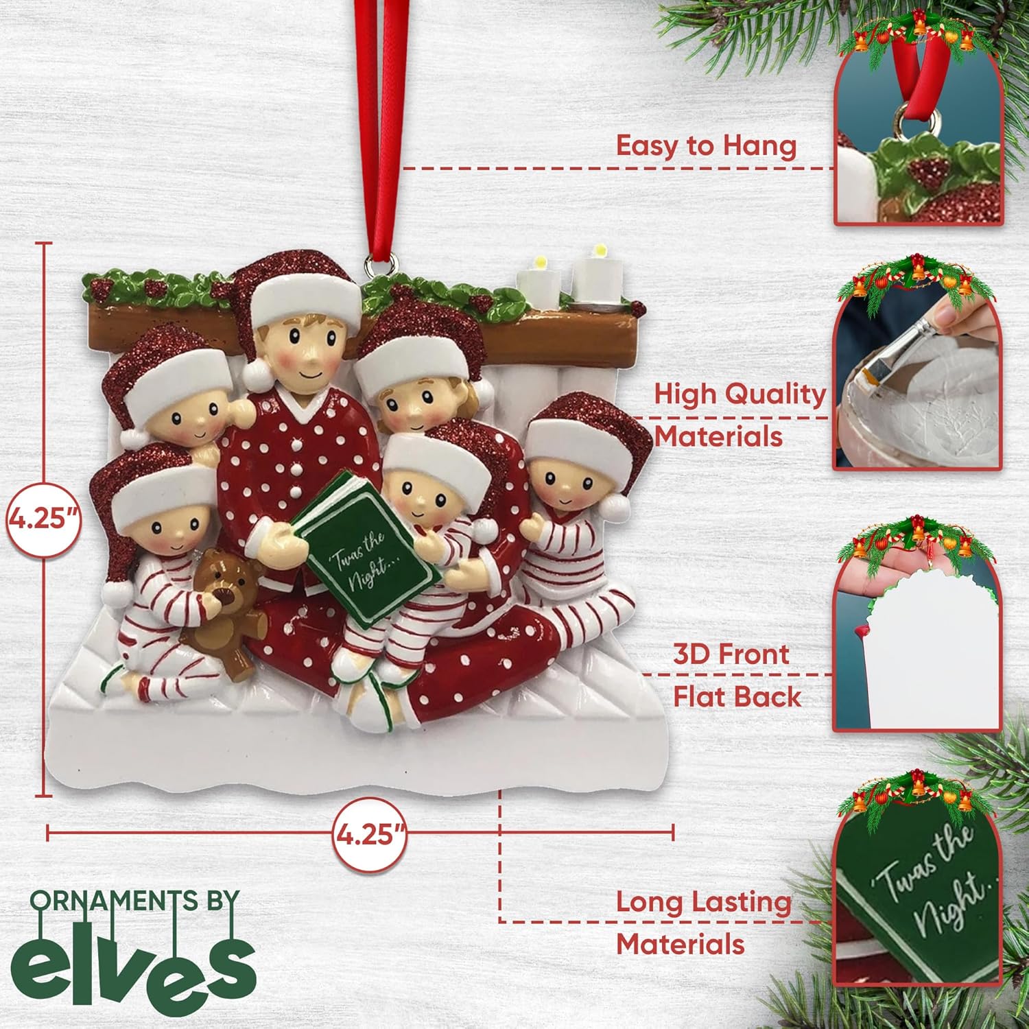 - đ Celebrate Your Family of 6: Mark a joyful milestone with a personalized family of 6 Christmas ornament 2025. Whether itâs your first year as six or part of a cherished tradition, this keepsake honors your growing bond and tells your story with warmth, love, and festive cheer. This bedtime Christmas story ornament captures a magical moment with a family of six in striped pajamas, all wearing glittery red Santa hats. Theyâre cozied up while holding âTwas the Night⊠book, surrounded by soft details like a teddy bear and holiday candles for extra warmth.