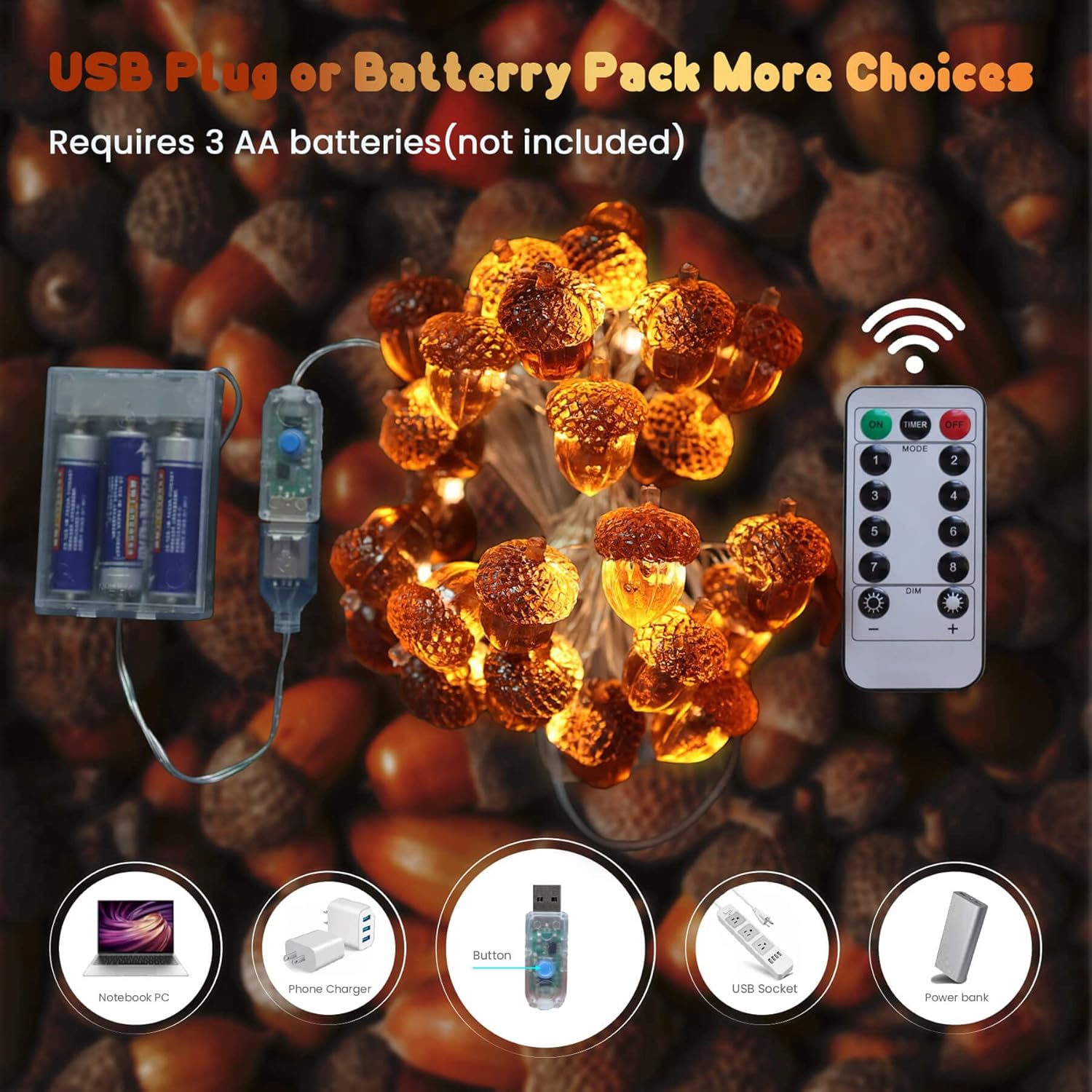 - 【3D Acorn, Not Flat on One Side 】THREE DIAMENSIONAL Acorn lights, Not Flat on one side. Similar size of the real acorn nuts. Light up from inside, give off warm amber light, A great Fall thanksgiving ornament.