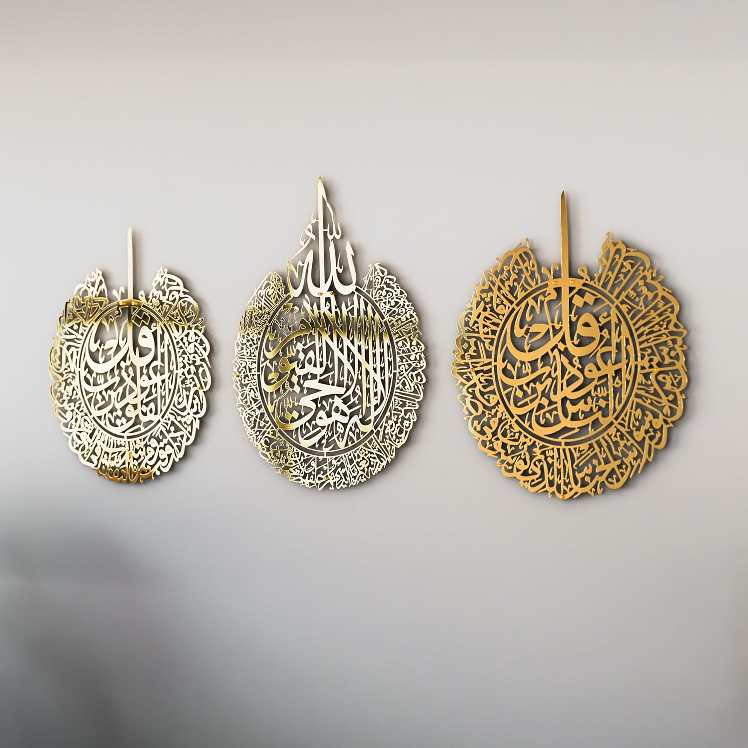 - The Elegance of Art: Crown your home with this elegant metal Islamic wall art. Featuring the Ayat al-Kursi, Surahs al-Falaq, and al-Nas, it's a magnificent union of Quranic verses and masterful Arabic calligraphy.