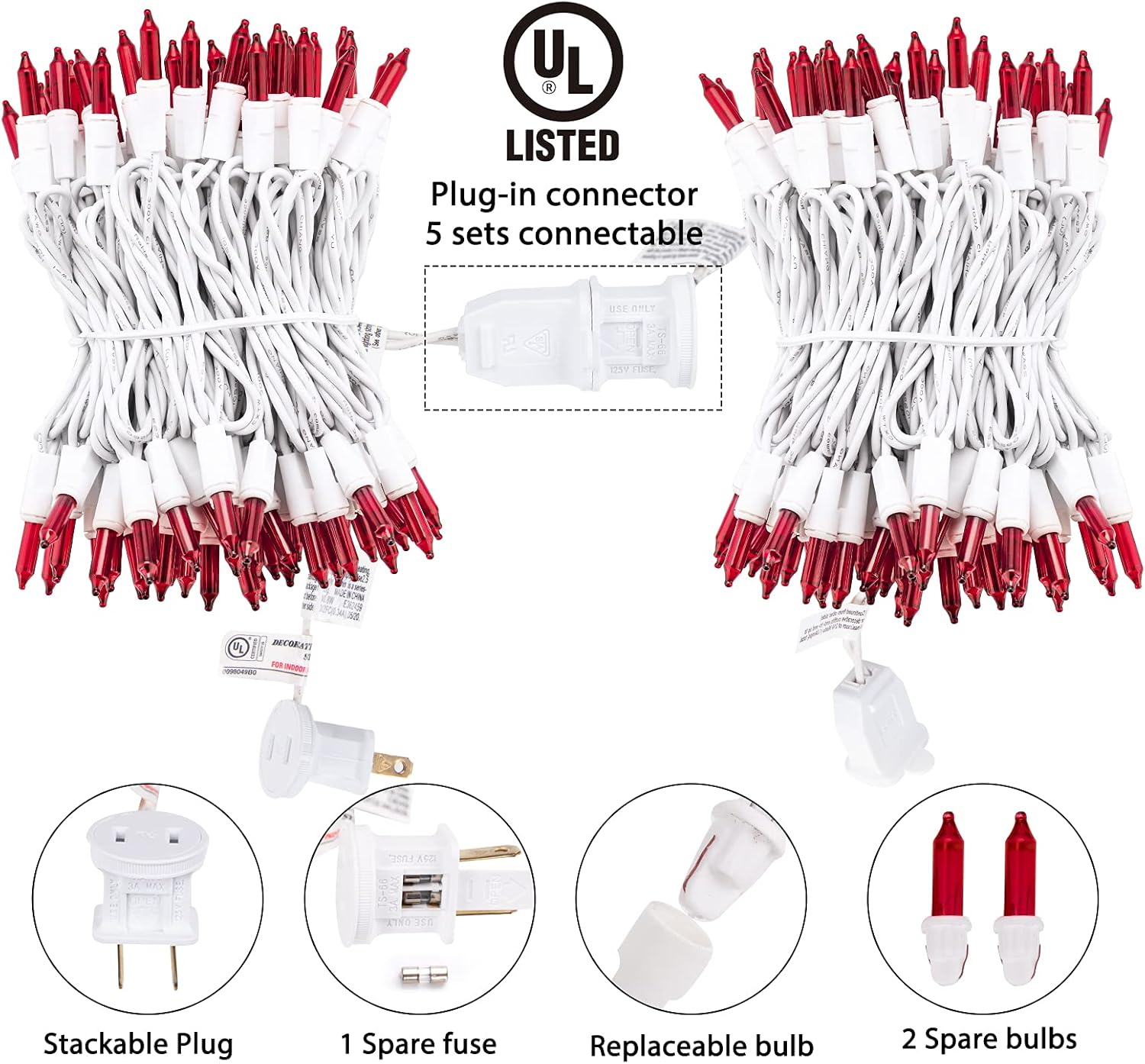 - Creative Mini Red Christmas Lights Set: This Christmas light on white wire set includes 100 transparent mini-lights, total length 26.5 feet white wires, and each bulb is 2.5 inches apart. It can be connected end-to-end to meet your decoration needs, up to 5 creative light strings