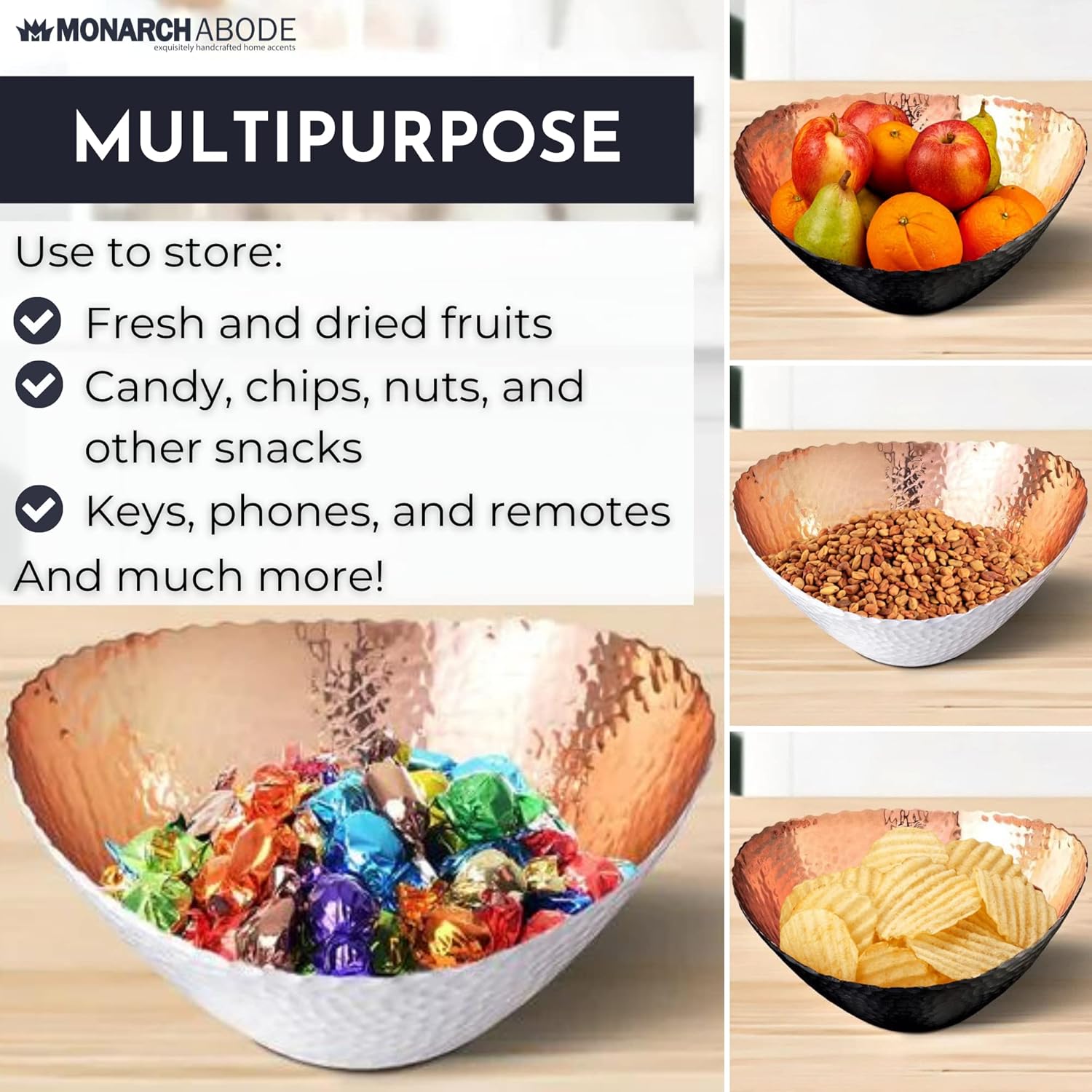 - PERFECT SIZE FOR HOME DECOR: Measuring 7.5 x 6.75 x 3.5 inches, this large decorative bowl is ideal for both practical use and stylish display. Great as a modern fruit bowl, decor bowl, or key dish bowl for entryway table—a standout addition to any room. Its hammered design and exquisite finish make it an attractive centerpiece for any kitchen countertop, dining table, or coffee table, adding a touch of sophistication to your home decor.
