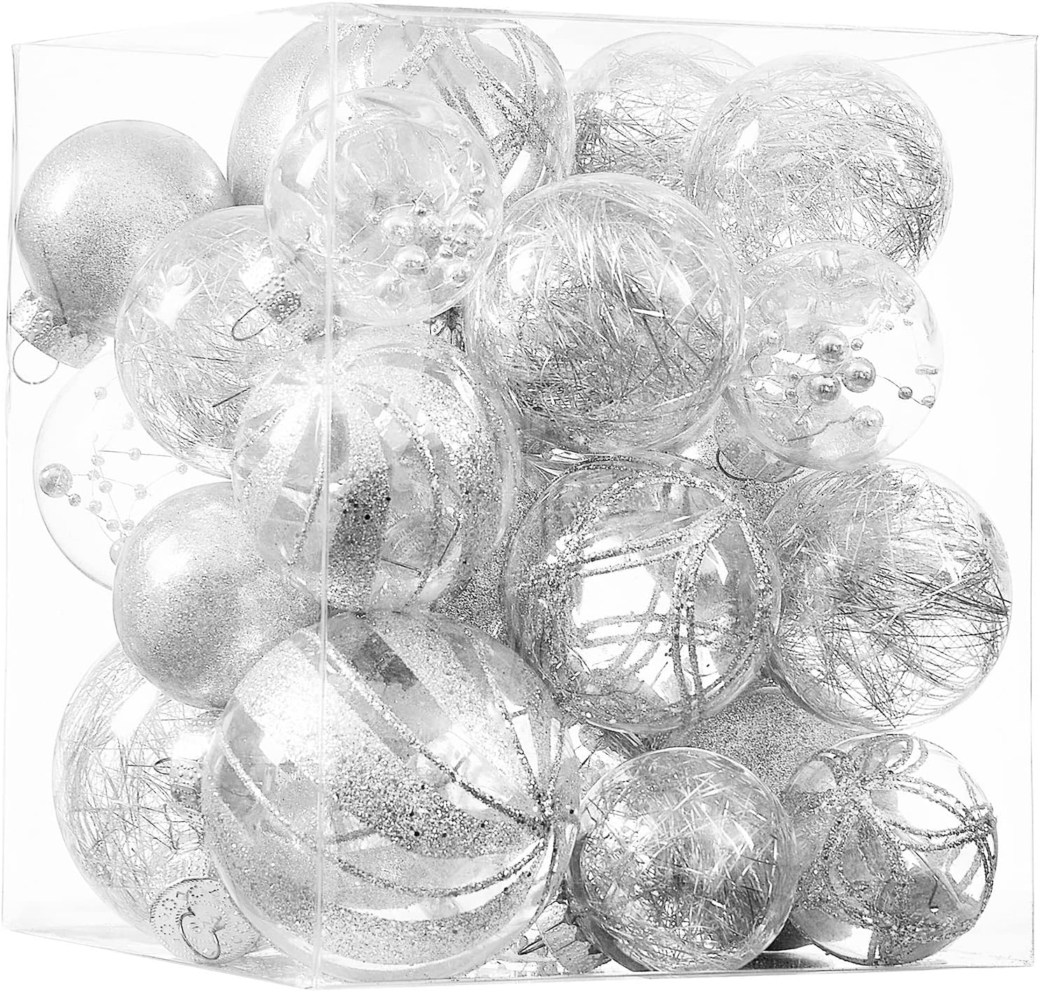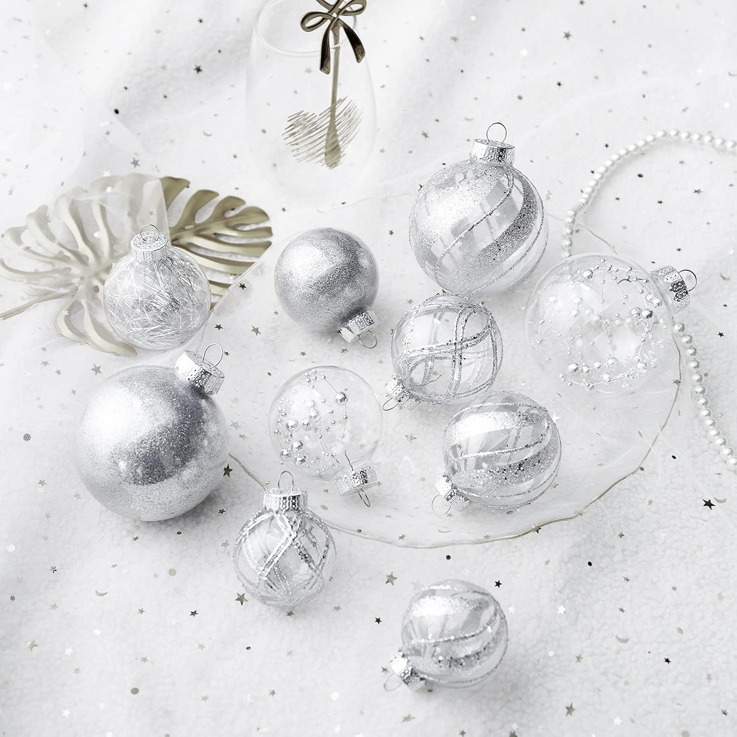 - Silver Christmas Ball Ornaments--These 24ct clear Christmas decorations are made of durable and environmentally friendly plastic with excellent shatter resistance. These Christmas balls have shiny decorations and a transparent glaze base, which are perfect for hanging on your Xmas tree and decorating your Home with them,this will become part of your vacation.
