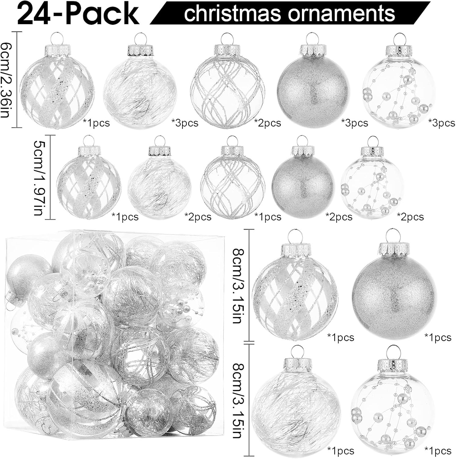 Clear Christmas Ball Ornaments,24ct Shatterproof Plastic Decorative Christmas Ornaments Hanging Xmas Tree Baubles Set with Stuffed Delicate Glittering Decorations for Holiday Party Home Decor (Silver)