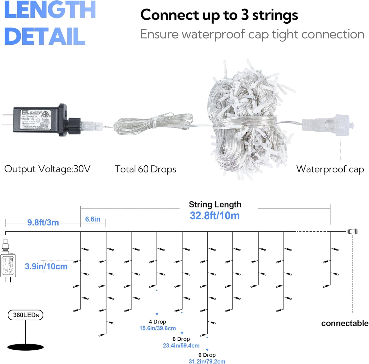 - đăConnectable for Wide Useă: Our icicle Christmas lights adopt 360L bright led bulbs,42.6ft/ 13m long in total with total 60 drops.Drop lengths 16''- 24''- 31''- 24'', number of light bulbs is 4, 6, 8, and 6 respectively. The outdoor string lights is extendable,can maximum connect with 3 sets.clear wire looks simple but dreamy.You can hang them on roof, hedge, fence, prom, patio, eave, handrail etc, creating romantic atmosphere for wedding,party,Valentine's Day,Christmas,New Year.