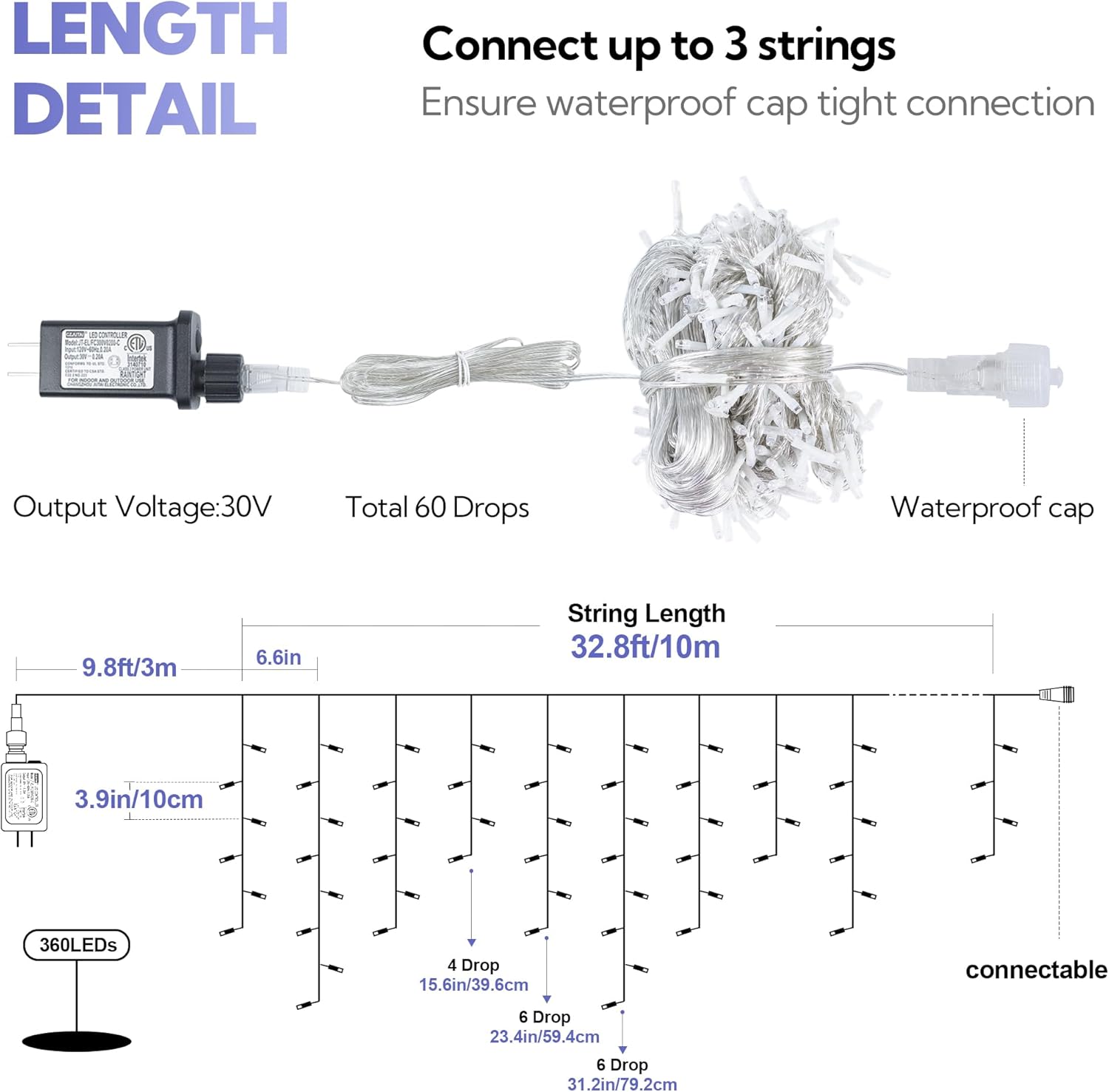 - đăConnectable for Wide Useă: Our icicle Christmas lights adopt 360L bright led bulbs,42.6ft/ 13m long in total with total 60 drops.Drop lengths 16''- 24''- 31''- 24'', number of light bulbs is 4, 6, 8, and 6 respectively. The outdoor string lights is extendable,can maximum connect with 3 sets.clear wire looks simple but dreamy.You can hang them on roof, hedge, fence, prom, patio, eave, handrail etc, creating romantic atmosphere for wedding,party,Valentine's Day,Christmas,New Year.