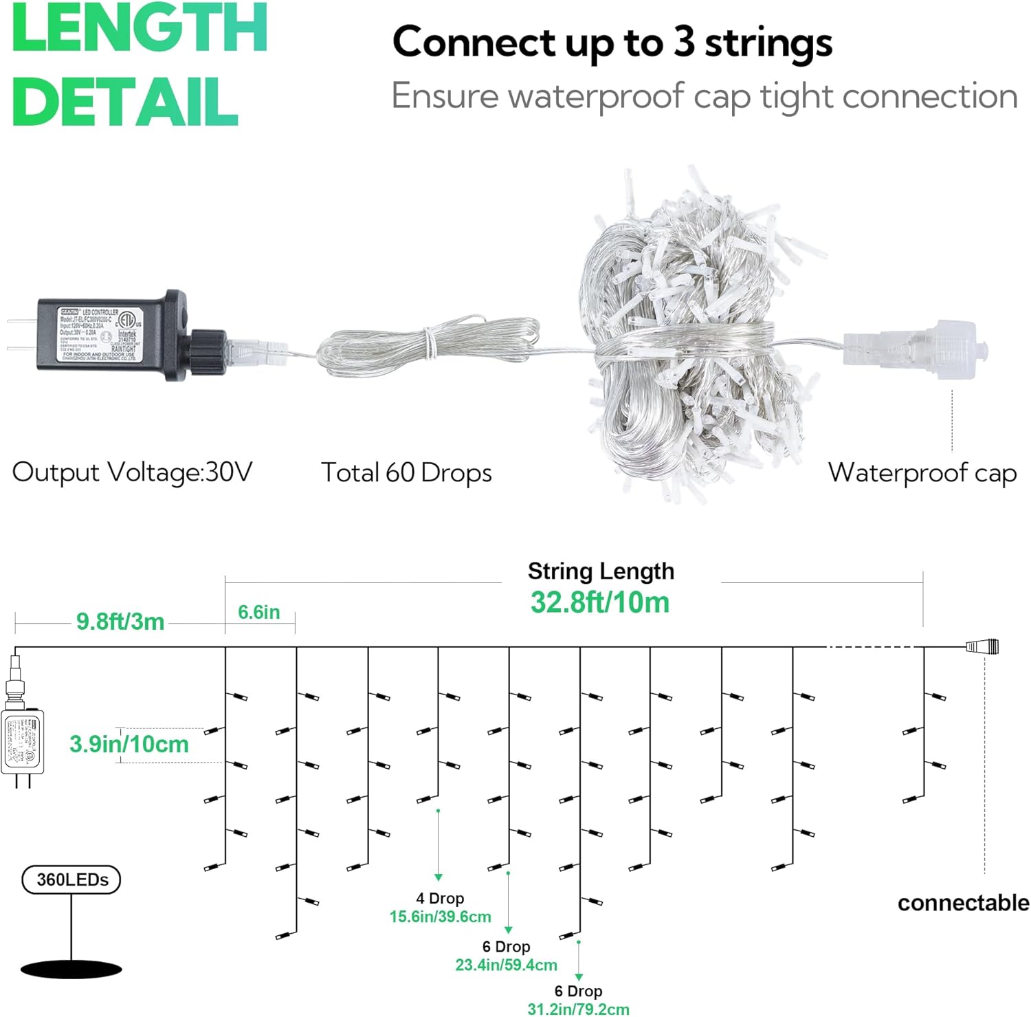 - đăConnectable for Wide Useă: Our icicle Christmas lights adopt 360L bright led bulbs,42.6ft/ 13m long in total with total 60 drops.Drop lengths 16''- 24''- 31''- 24'', number of light bulbs is 4, 6, 8, and 6 respectively. The outdoor string lights is extendable,can maximum connect with 3 sets.clear wire looks simple but dreamy.You can hang them on roof, hedge, fence, prom, patio, eave, handrail etc, creating romantic atmosphere for wedding,party,Valentine's Day,Christmas,New Year.