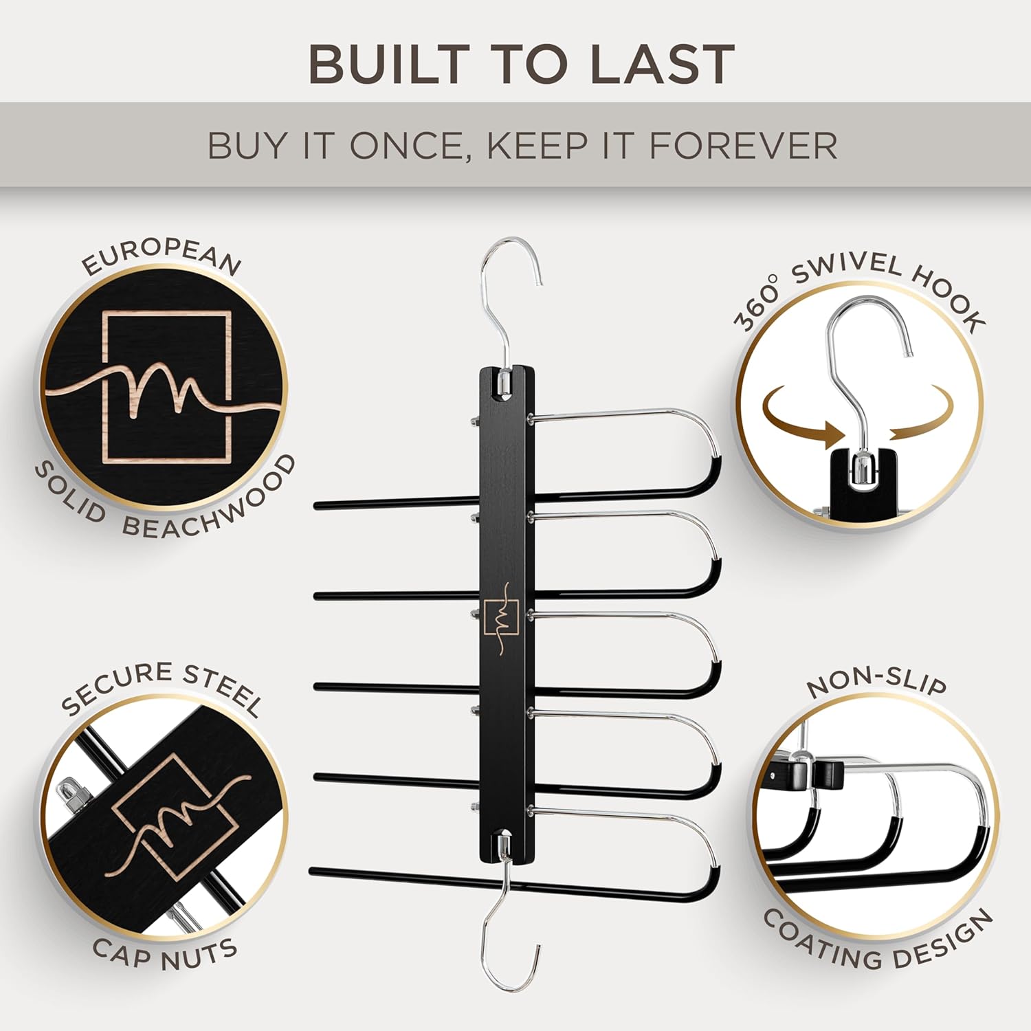 - PREMIUM QUALITY BEECH WOOD - Our beech wood gives you a durable and sturdy clothes hanger organizer built to last. Whether using for light scarf storage or heavy pants our multi functional pants holder will not not bend or collapse thanks to our quality crafted beech wood hanger organizers.