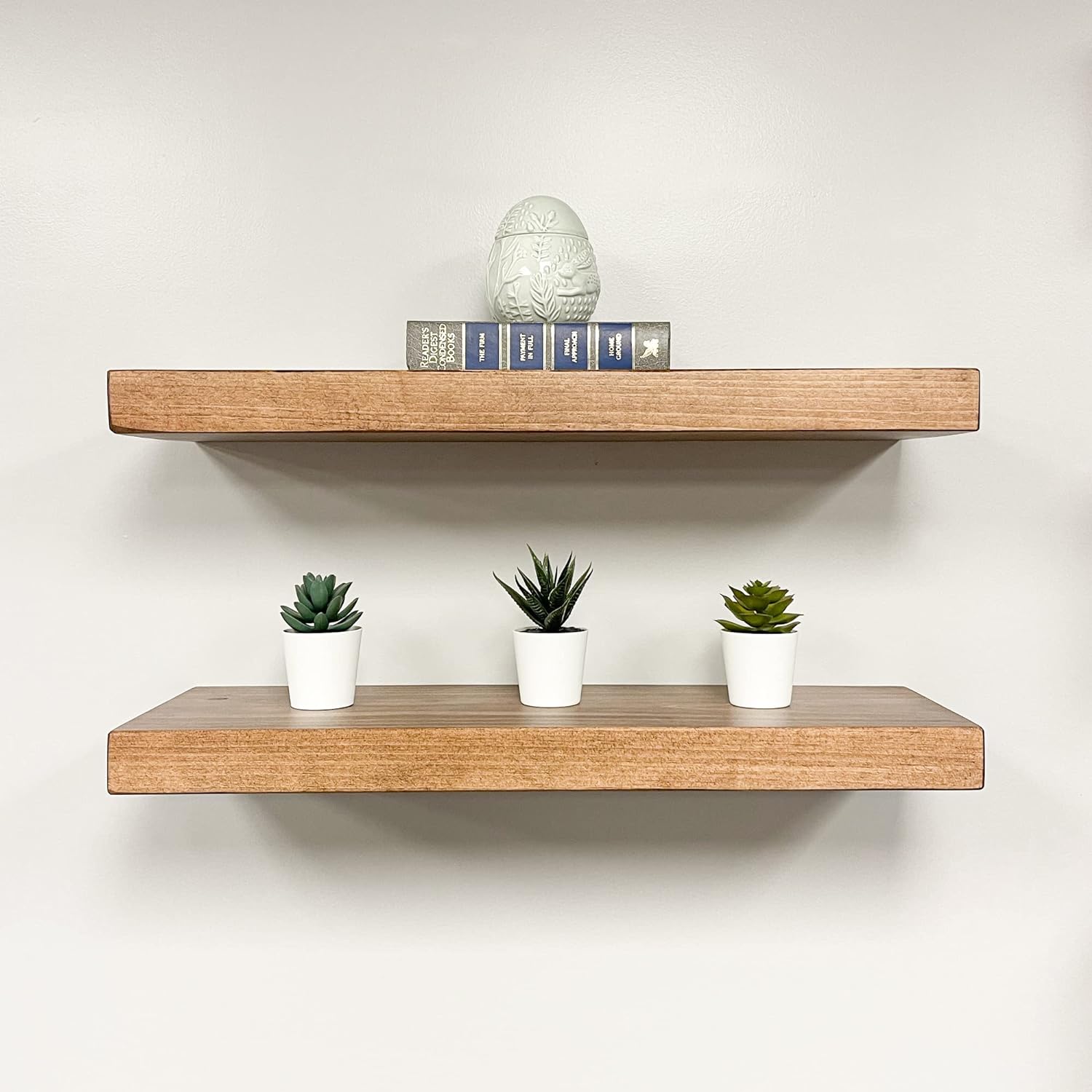 - HIGH QUALITY FLOATING SHELVES: each shelf is 1 3/4'' thick handcrafted from solid pine in USA and made to last. Our shelves are protected with polyurethane and are ready to be used. Support up to 40 pounds of weight per stud (2 studs=80pounds). Easy to install.