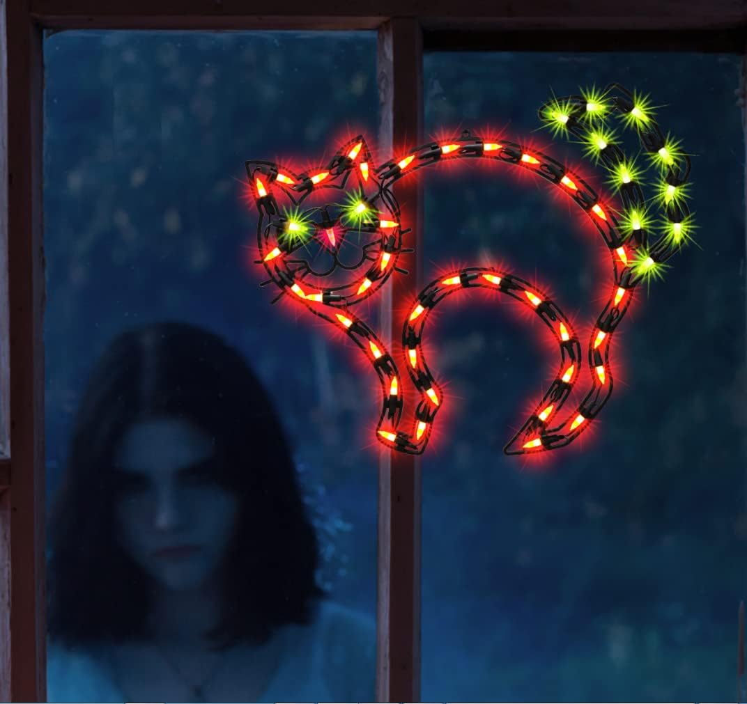 - Halloween Window Silhouette Decoration: 50 mini lights Cat Light measures 17 x 11.8 -Inch; 2 pcs replacement bulbs,2 flasher bulb, 2pcs spare fuses,2 pcs zip ties and 1 pc suction cup included.