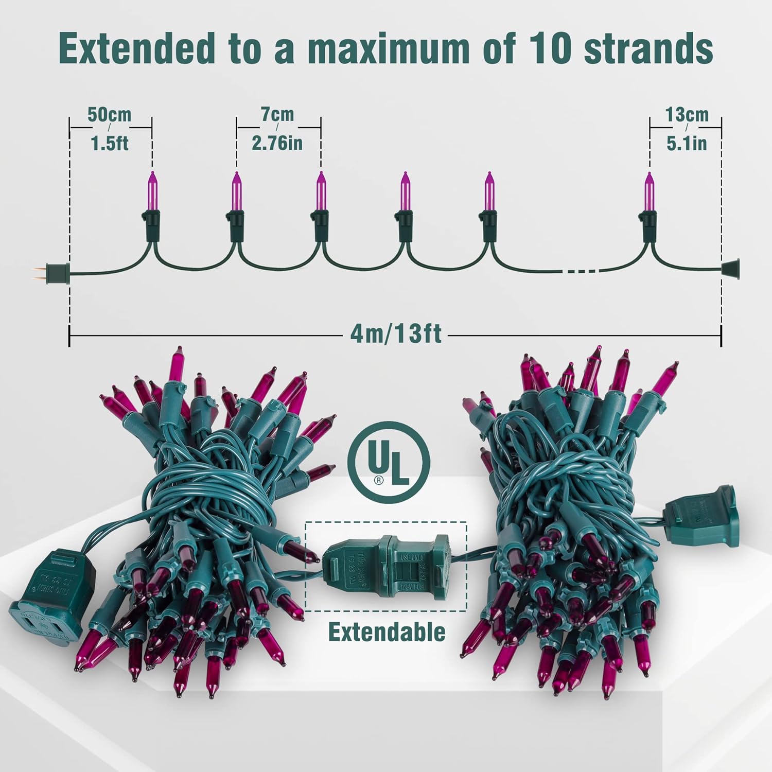 - 🔮End-to-end Connectable Lights:Our purple lights allow you to connect end to end up to 10strings (500 lights),stack-able plugs provide convenient installation.Just plug in and unplug it for power on and off.Hang them around your house, party with your families and pal!