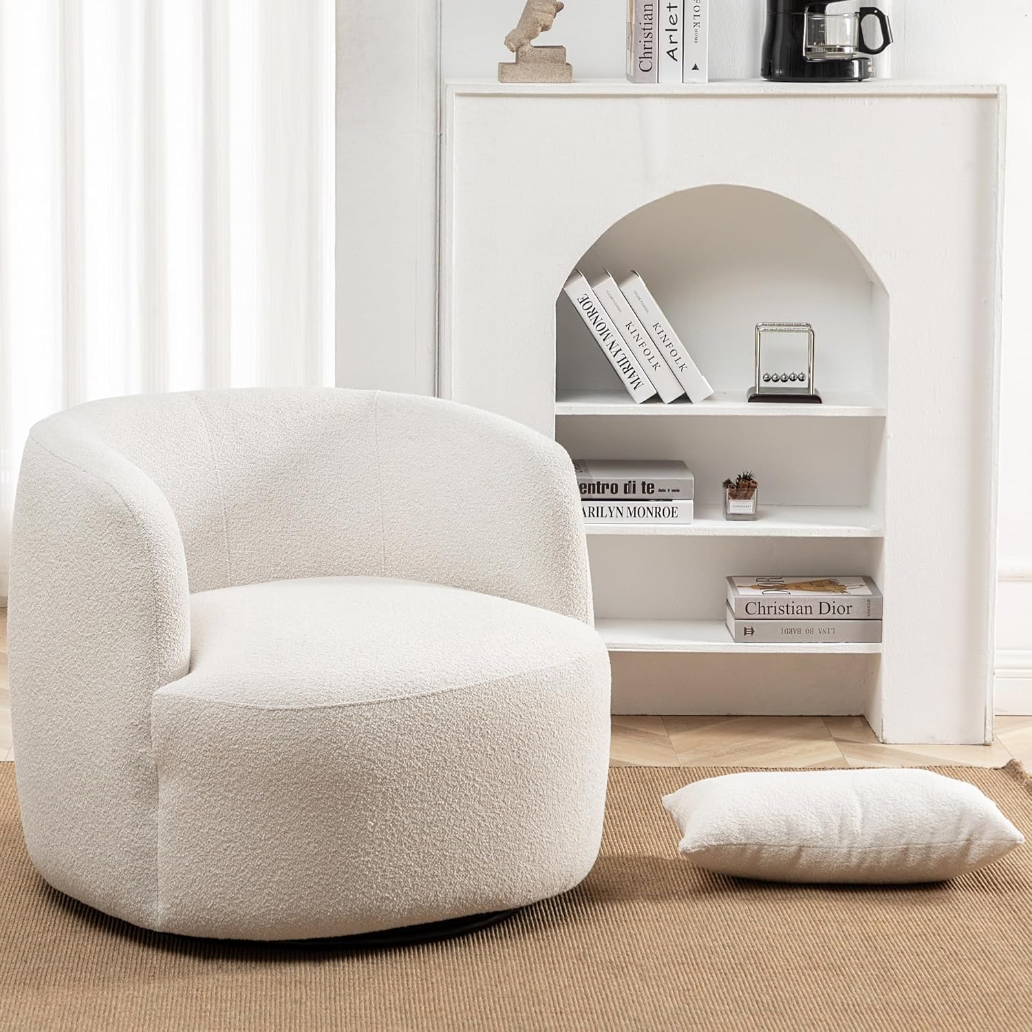 KINWELL 34" Wide Boucle Swivel Barrel Chair, No Assembly Round Upholstered Armchair Accent Chair Single Sofa Chair with Toss Pillow for Living Room and Bedroom, Beige