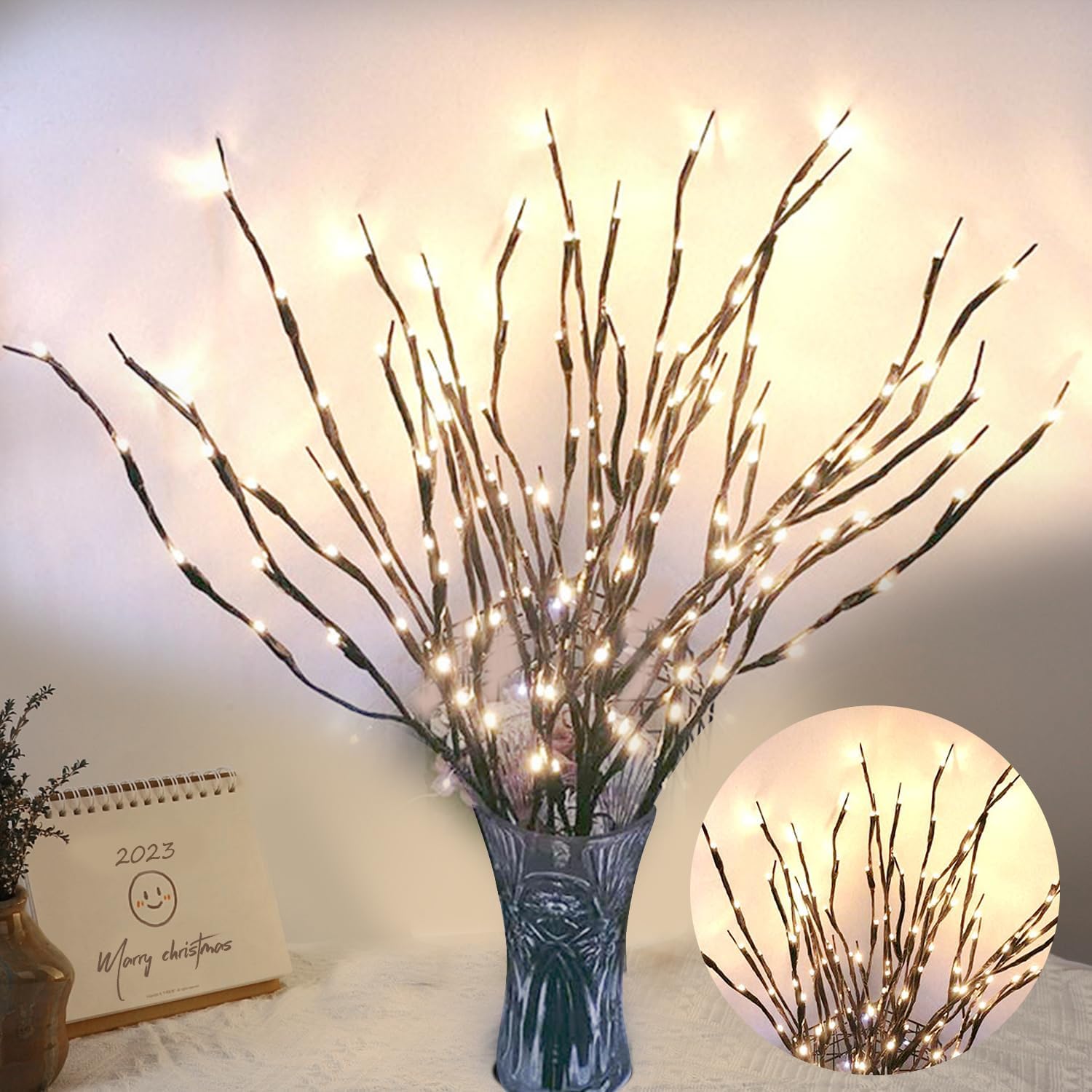 - Specification -- Each decorative willow twig lights comes with 5 bendable stems, 30 inches total length, and 20 led warm white light bulbs. 2 packs of branch lights together to make the foliage look more lush.