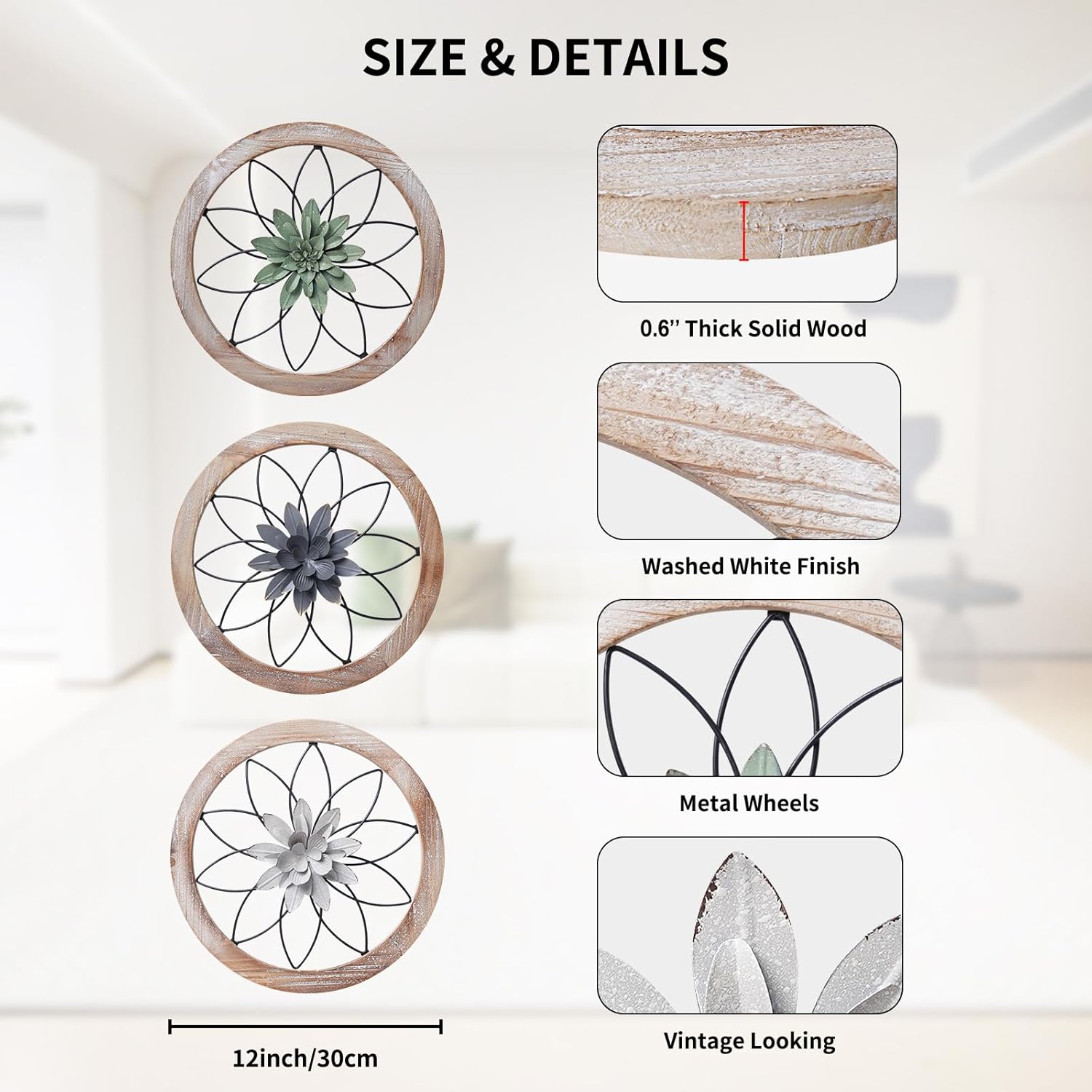 - FARMHOUSE WALL DECOR -- These 3 pcs round kitchen wall decor made of fir wood frame and metal wheels, come with 6 replaceable metal flowers, the rustic style is perfect for both modern or farmhouse home decor