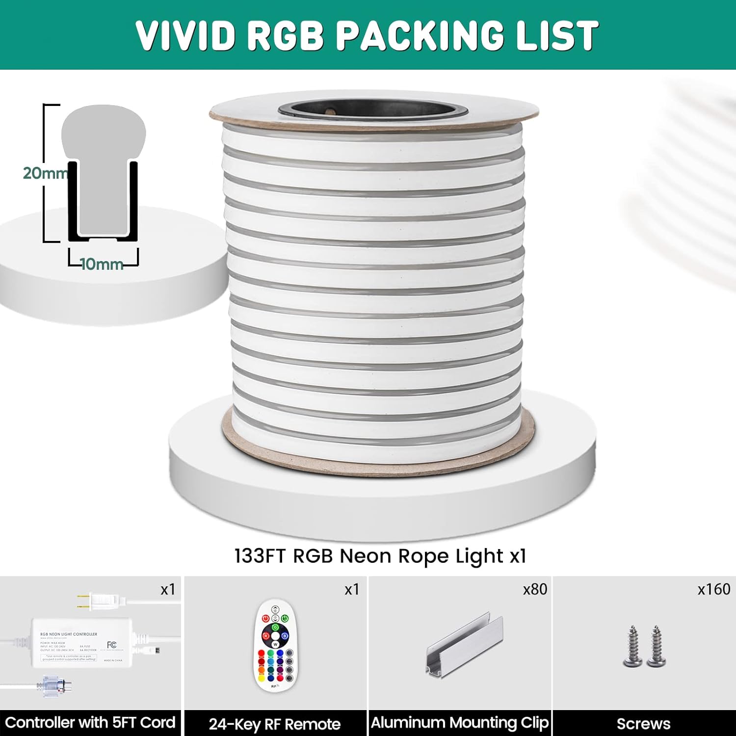 GZBtech RGB LED Neon Rope Lights 133FT/40M, AC 110-120V Waterproof Color Changing LED Rope with Remote Controller, Dimmable Multi Color Neon Rope Lighting for Indoor Outdoor Commercial Use