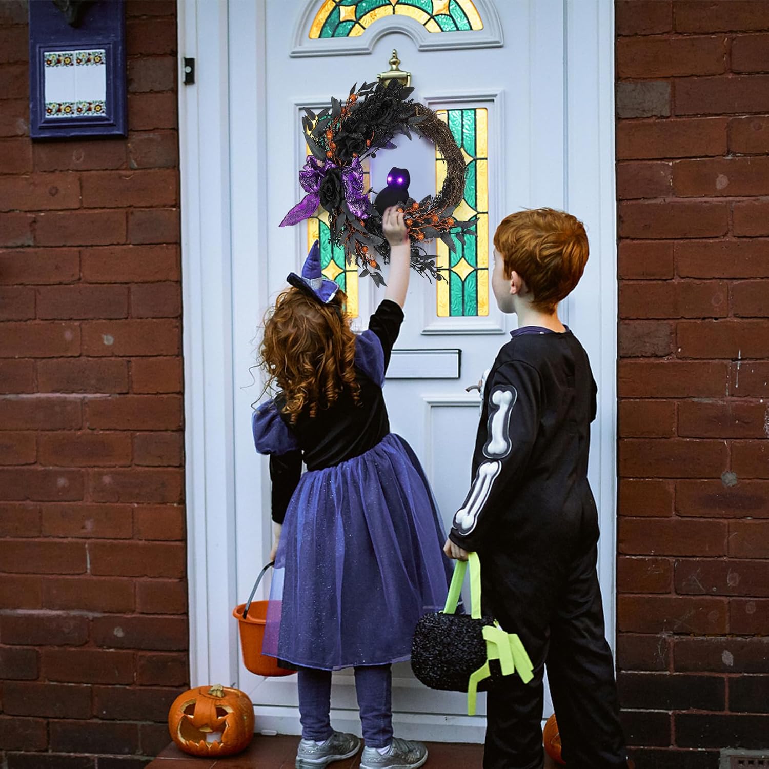 22 Inch Halloween Wreath with Lighted Eyes, Black Prelit Wreath with Artificial Roses, Willow Leaves, Ribbon for Indoor/Outdoor Home Decor