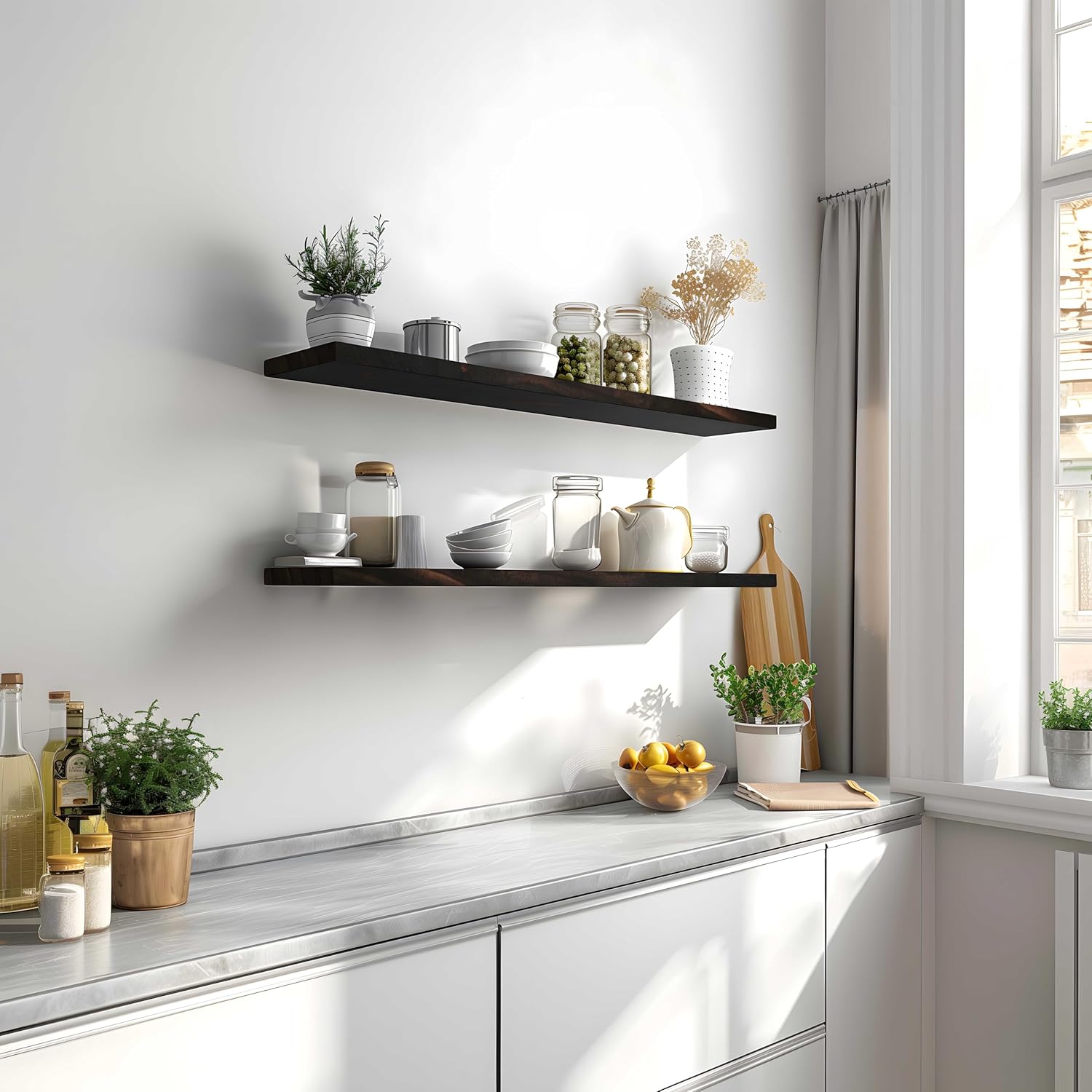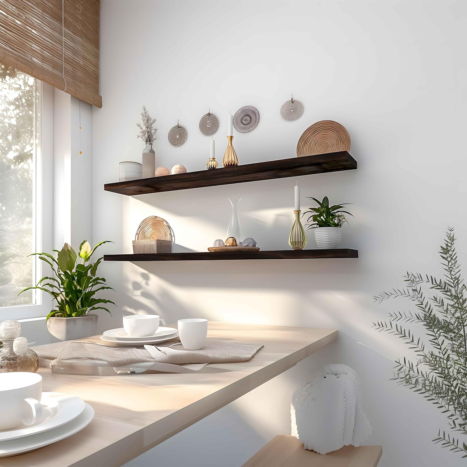 - Home decor and storage shelves - This wall shelves are the perfect piece for any rustic, modern, or natural home decor. They allow to better organize spaces, helping you conveniently store everything from alarm clocks, books, pictures to potted plants.