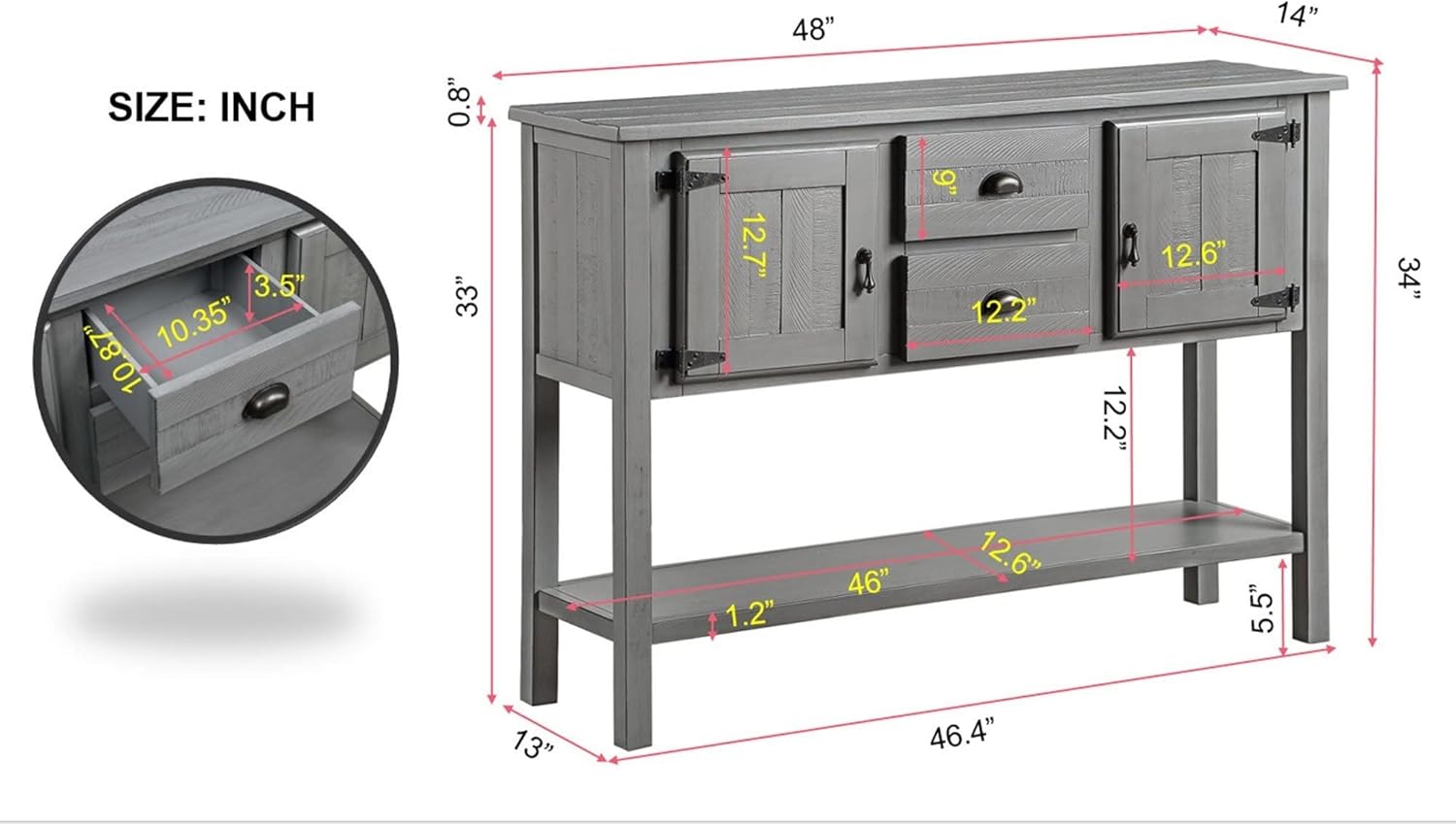 - ăRetro Sofa TableăThe console table 48 '' L* 14 '' W*34'' H .Solid Wood Sideboard Console Table features a retro design that adds a touch of vintage charm to your foyer, entryway, or dining room. Its classic aesthetic enhances the overall ambiance of your space.