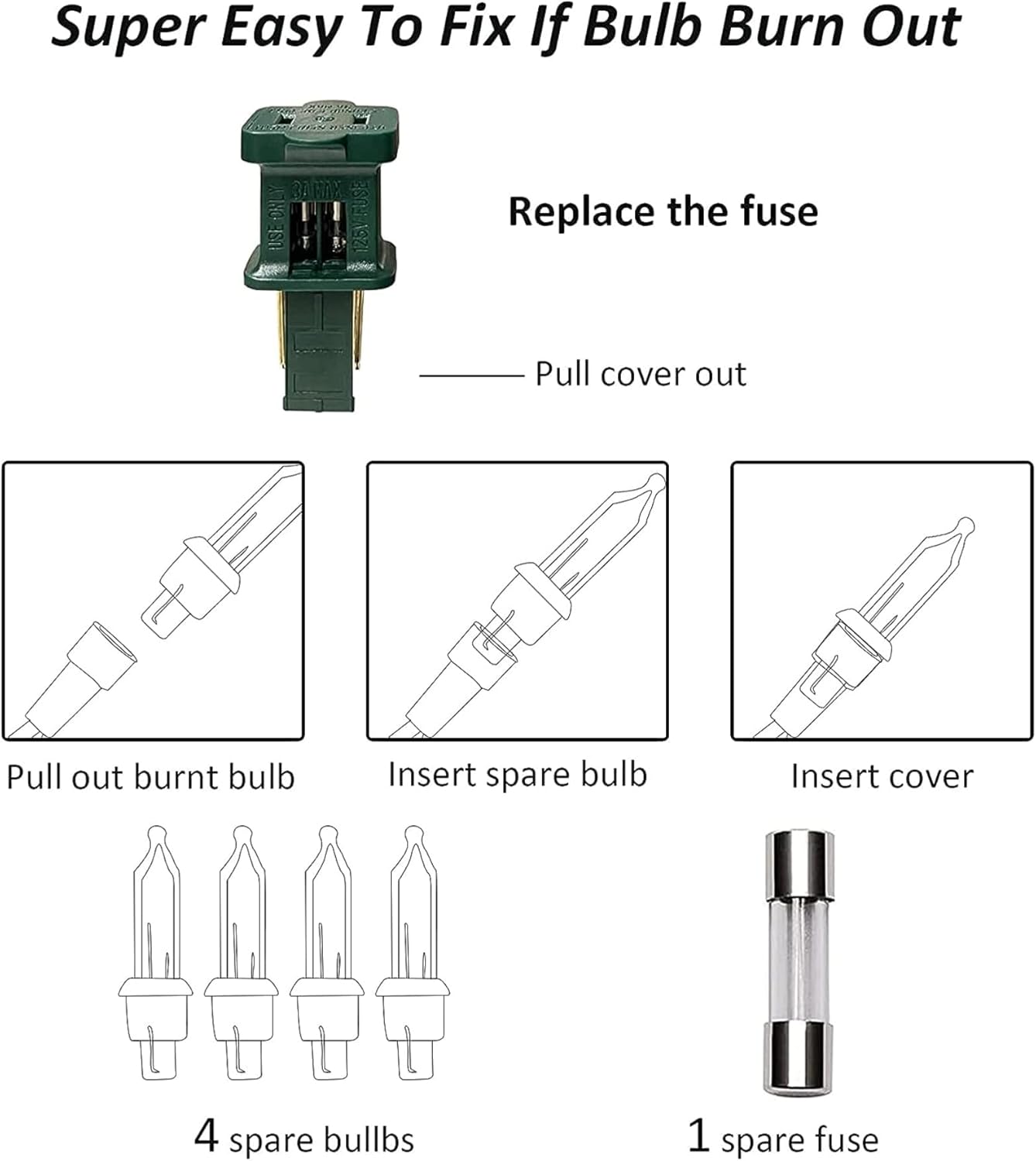 - Christmas Mini String Lights: The Christmas mini string lights includes 100 count incandescent light bulbs, the total length is 20 ft, the length of string light is 18.5 ft, lead wire is 1.5 ft, spacing between each light is 2.25 inches. Package Includes: 1 x 20 ft light string, 1 x spare fuse, 4 x additional incandescent bulbs.