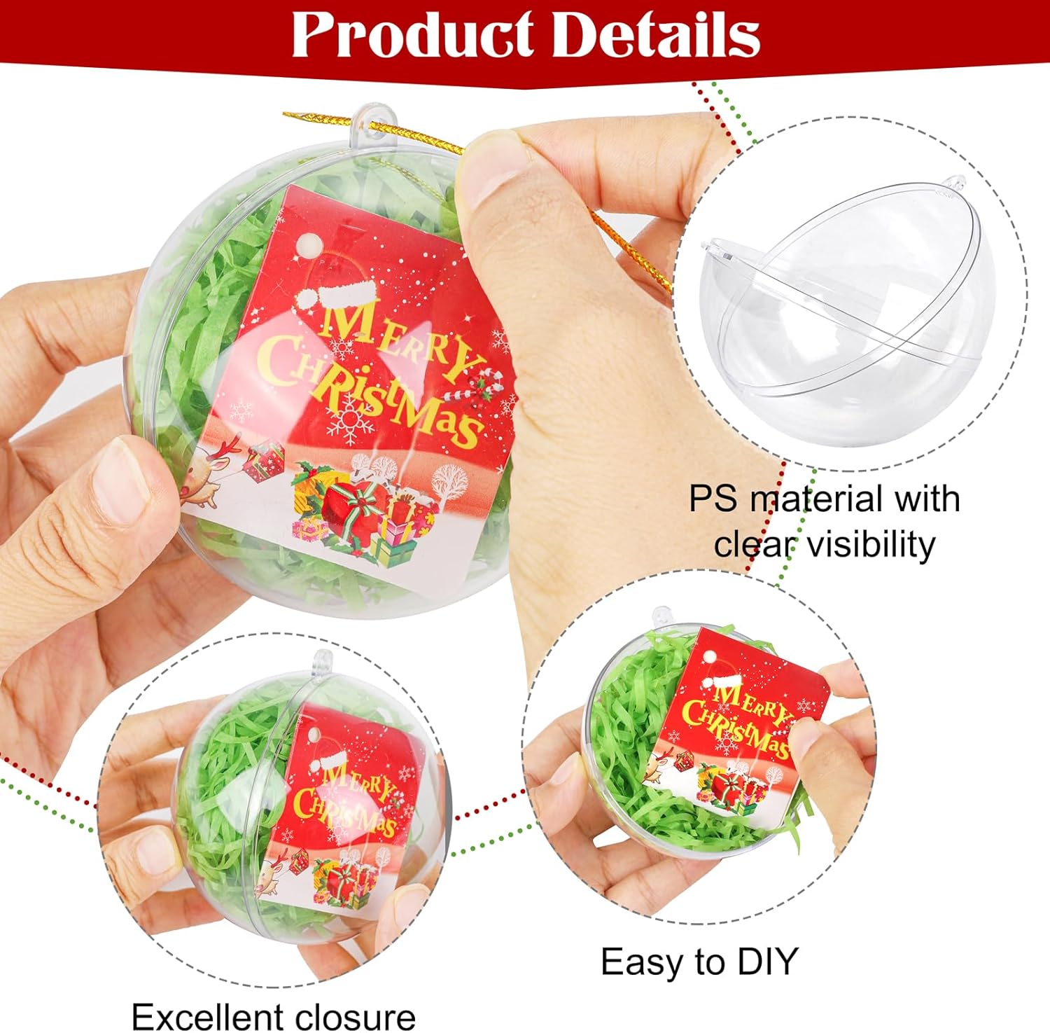 - Versatile application: these Christmas clear plastic fillable ball ornaments have a wide range of uses and can be customized according to the unique characteristics of different festivals, such as Christmas, weddings, New Year's celebrations, and other festive events; these filling Christmas balls are ideal for decorating Christmas trees, fireplaces, staircase railings, storefront displays, indoor and outdoor holiday decorations, gift packaging, candy packaging, and more