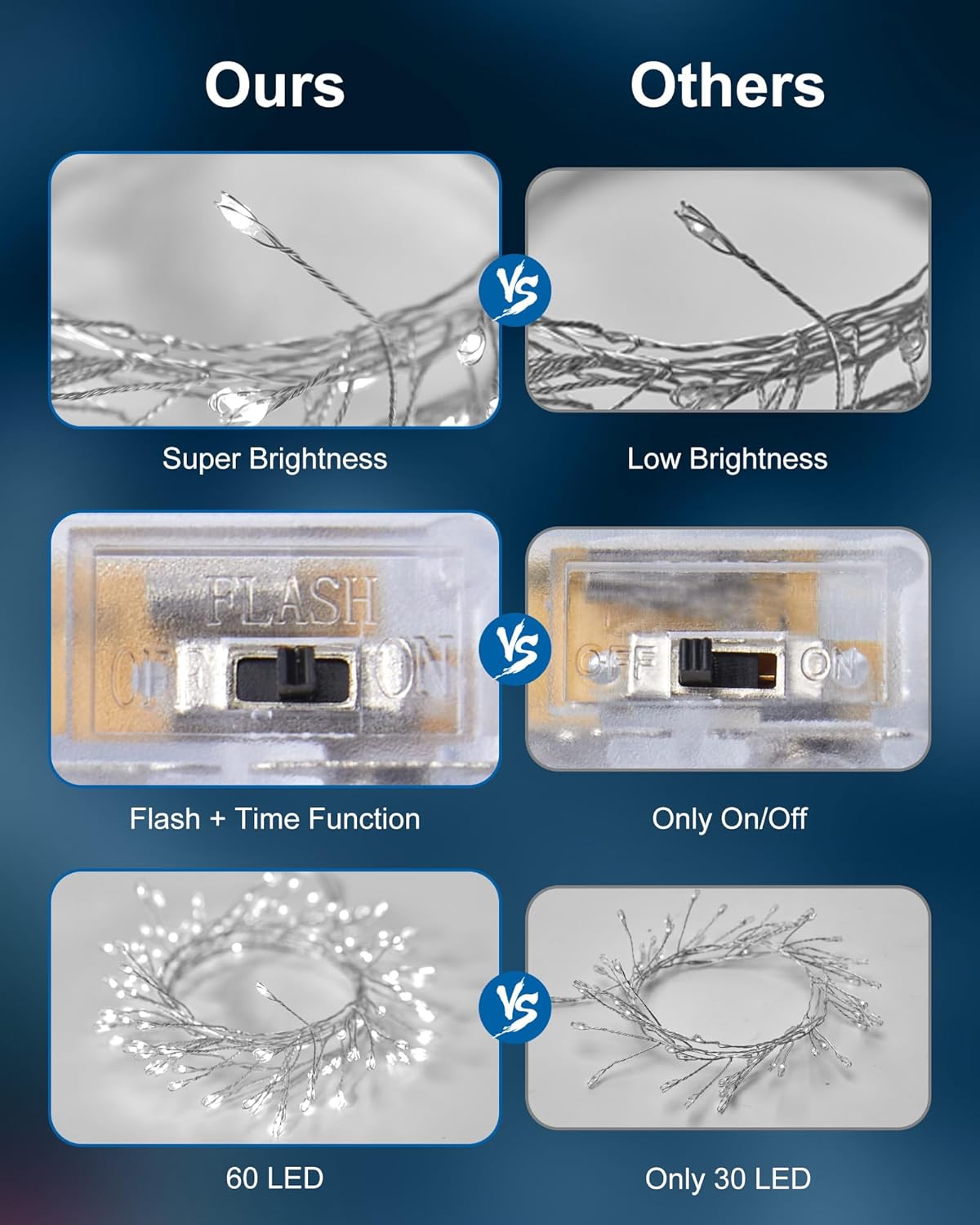 - Firefly Starry Lights: 60 super bright pure white LEDs lights on 5 feet long wire with 1 inches distance between LED bulbs and 12 inches clear cable between wire and battery box, 6 hours timing lighting, steady on or steady on + timer mode optional