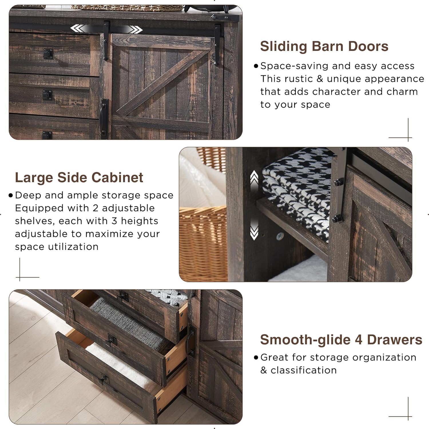T4TREAM 60'' Farmhouse Dresser Chests for Bedroom w/4 Drawers & Sliding Barn Doors, Wide Dresser TV Stand, Tall Chest of Drawers, Rustic Dresser Organizer for Bedroom, Living Room, Dark Rustic Oak
