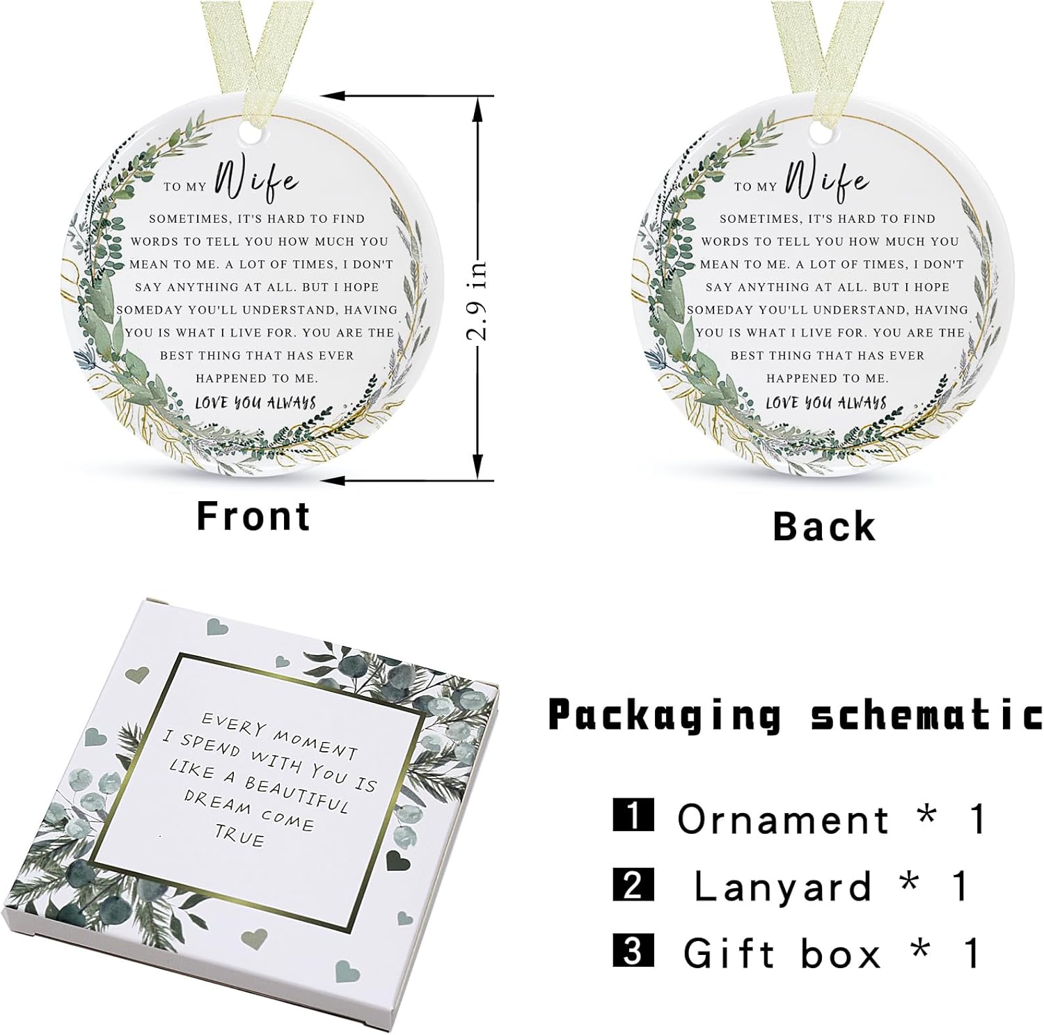 - đŒăPerfect and delicate sizeăThis is a wife memory ornament with a diameter of 2.9 inches and a thickness of only 0.18 inches. The product includes: a round wife ornamentt*1, a gift box*1 and a lanyard*1. The gift box comes with it makes it easy for you to give the best wife ever gifts directly to family and friends and other special people in your life, and the lanyard that comes with it helps to hang it easily on the Christmas tree or anywhere you want.