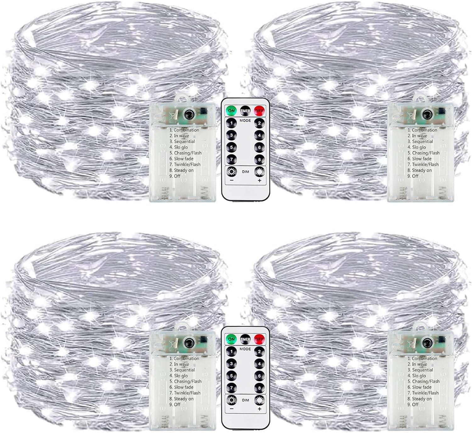 - Upgraded Fairy Lights Battery Operated: Designed with ultra-bright LEDs and durable silver wire, these battery fairy lights are built to last and make an excellent choice for decorating bedrooms, centerpieces, balconies, decks, and porches. Each set includes 4 strands of lights and 2 remotes, each 16ft long with 50 LEDs, powered by 3 AA batteries (not included)
