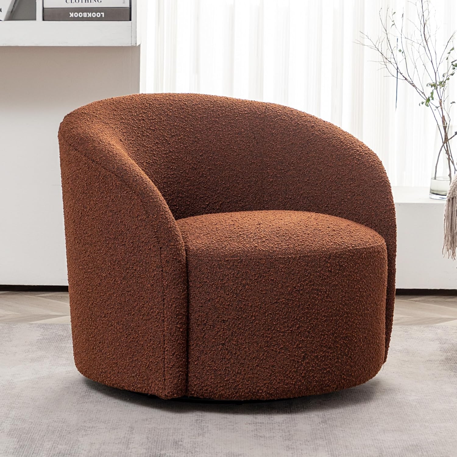 - BOUCLE UPHOLSTERY – This large Mid-Century Modern Swivel Barrel Chair is crafted with luxurious, popular boucle upholstery, providing a cozy, soft seating experience that instantly elevates your relaxation and comfort. Especially on cold days or when you are alone, bringing you the warmth of spring.
