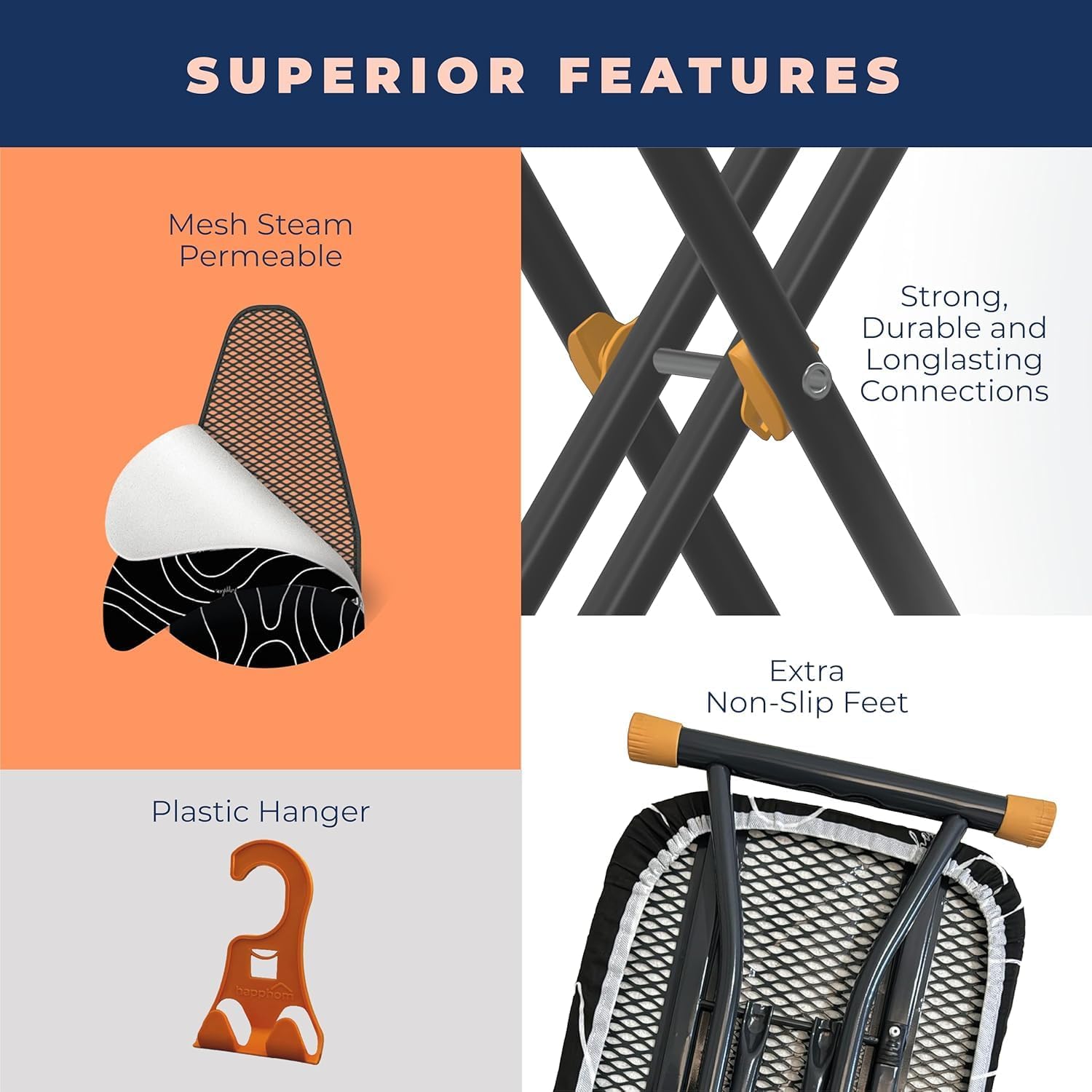 - SUPERIOR FEATURES: The ironing board panel is not easy to rot like particleboard; it can breathe and dissipate heat quickly with the help of steel mesh design. This ironing board offering ample room for regular ironing with 8 adjustable height from 26in to 33in, it creates a customized ironing height as needed. Extra Bonus Accessories; Heat Resistant Silicone Iron Rest Pad protects surfaces from hot iron.