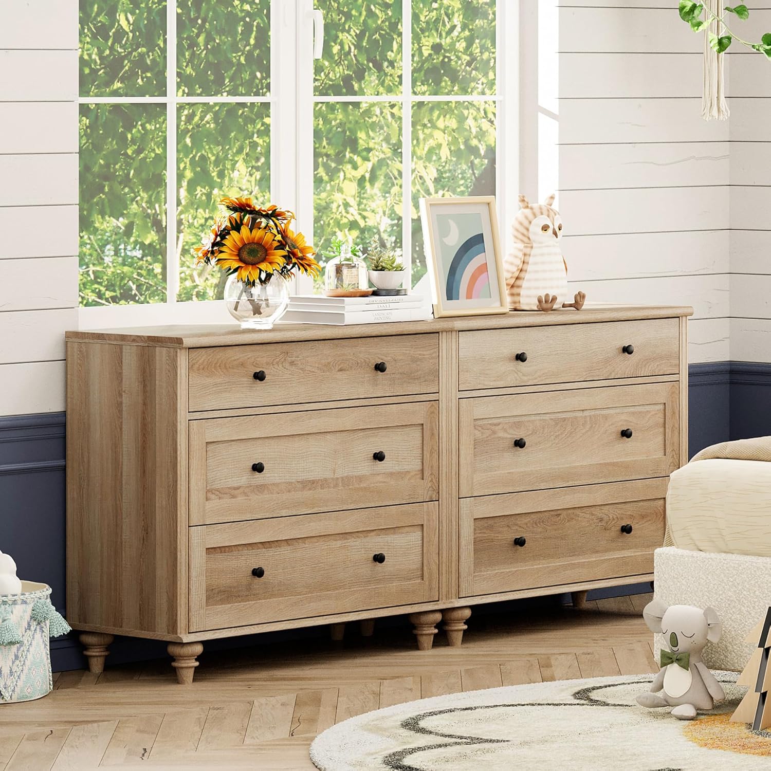 - 【Ample Storage Space】Featuring 6 deep drawers, the oak dresser is great to organize your clothes, blankets, etc. The bedroom dresser maximizes the vertical storage space while keeping your daily essentials and display decorations in order.Overall Dimension: 67.8''L×15.7''W×30.9''H