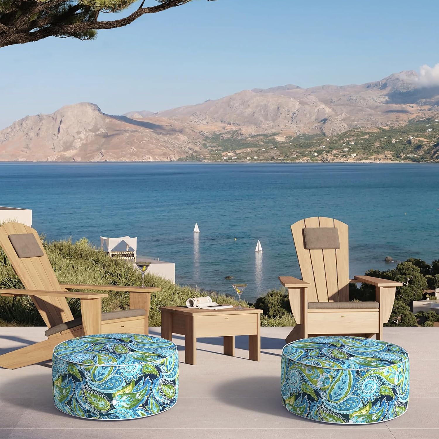 Inflatable Ottoman Stool D21 xH9 for Outdoor/Indoor Use, Water Repellent Patio Foot Rest with Portable Handle,Round Pouf Ottoman Suitable for Garden,Deck and Camping - Paisley Lapis Green