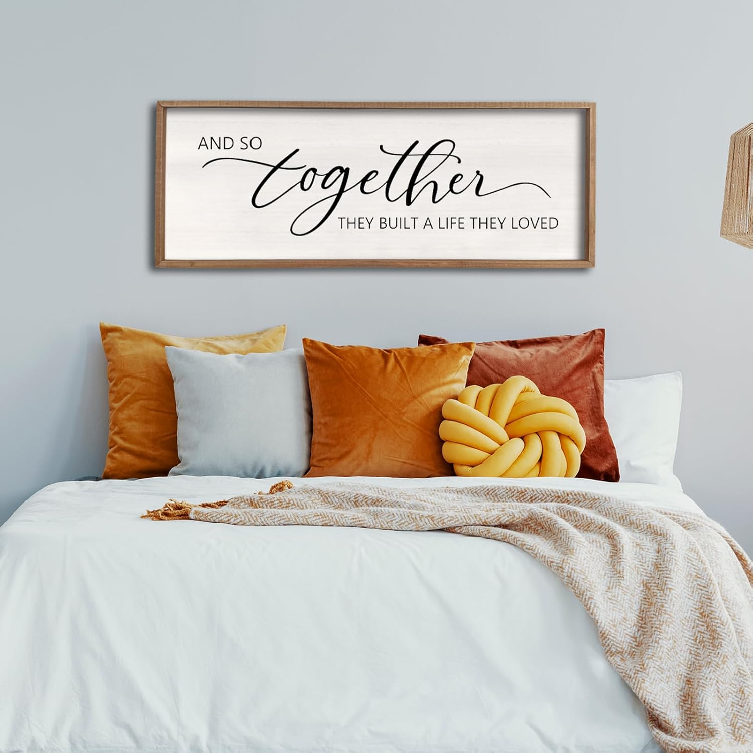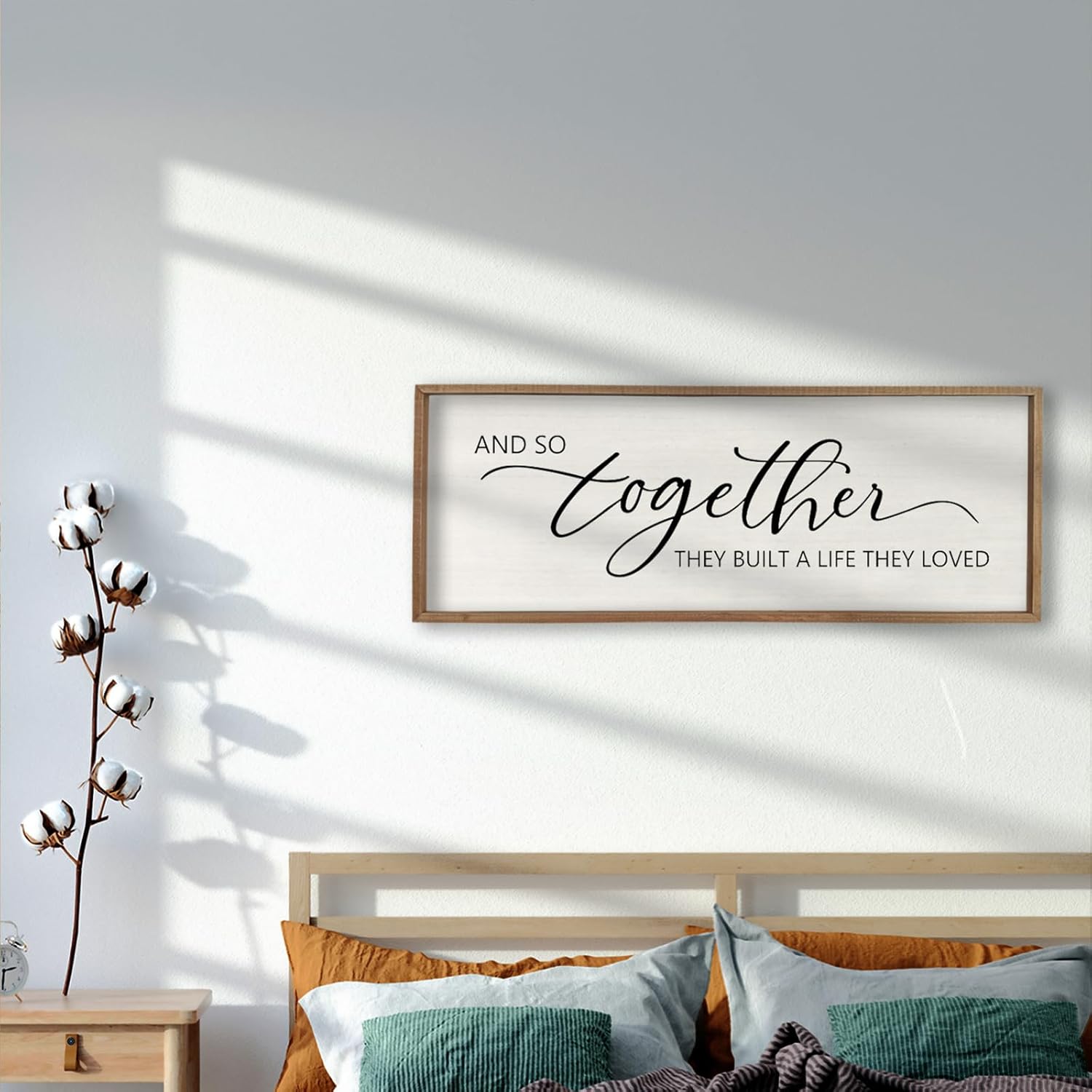 And So Together They Built A Life They Loved Framed Wood Farmhouse Sign - 32'X12' Master Bedroom Above Bed Wall Art for Love Sign Decor