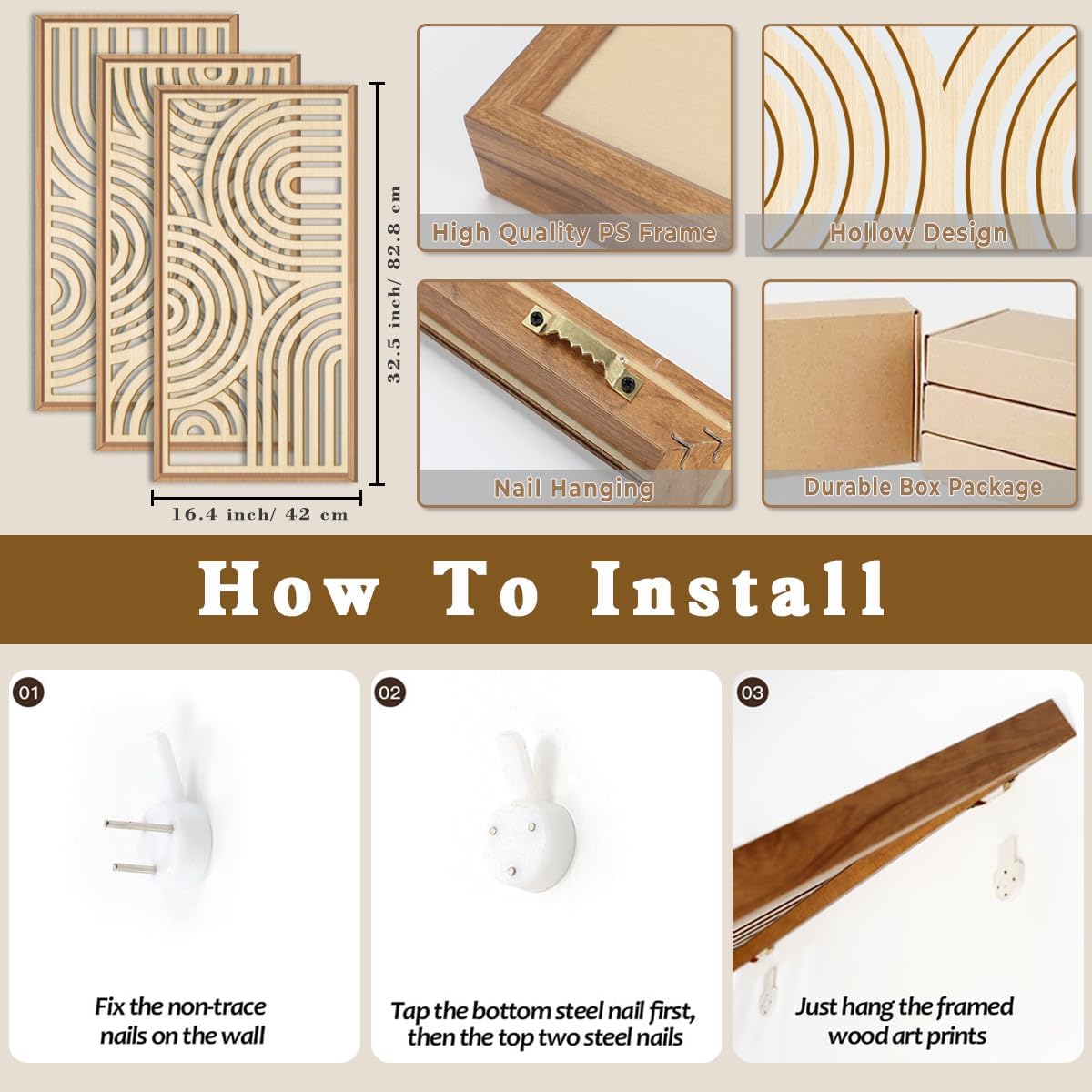 IARTTOP Large Boho Wood Wall Art Set of 3 Framed Wooden Mid-century Modern Wall Decor Minimalist Modern Abstract Geometric Decor for Living Room Bedroom Office-16x32 Inch