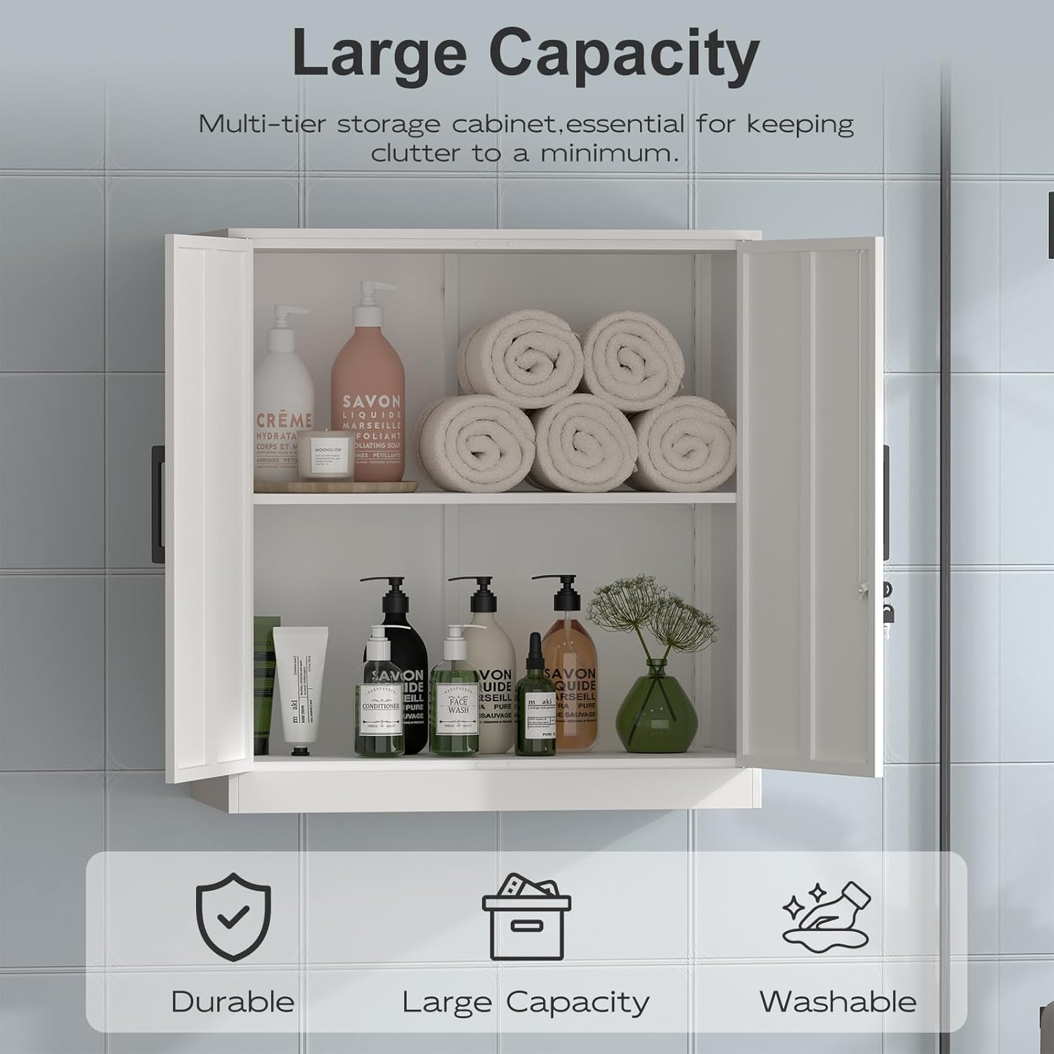 - ăSturdy Steel ConstructionăThe white wall cabinet is made of pure steel, sturdy and durable. All steel plates are treated with environmentally friendly powder coating, waterproof and corrosion resistant for easy cleaning. Further extend the service life.