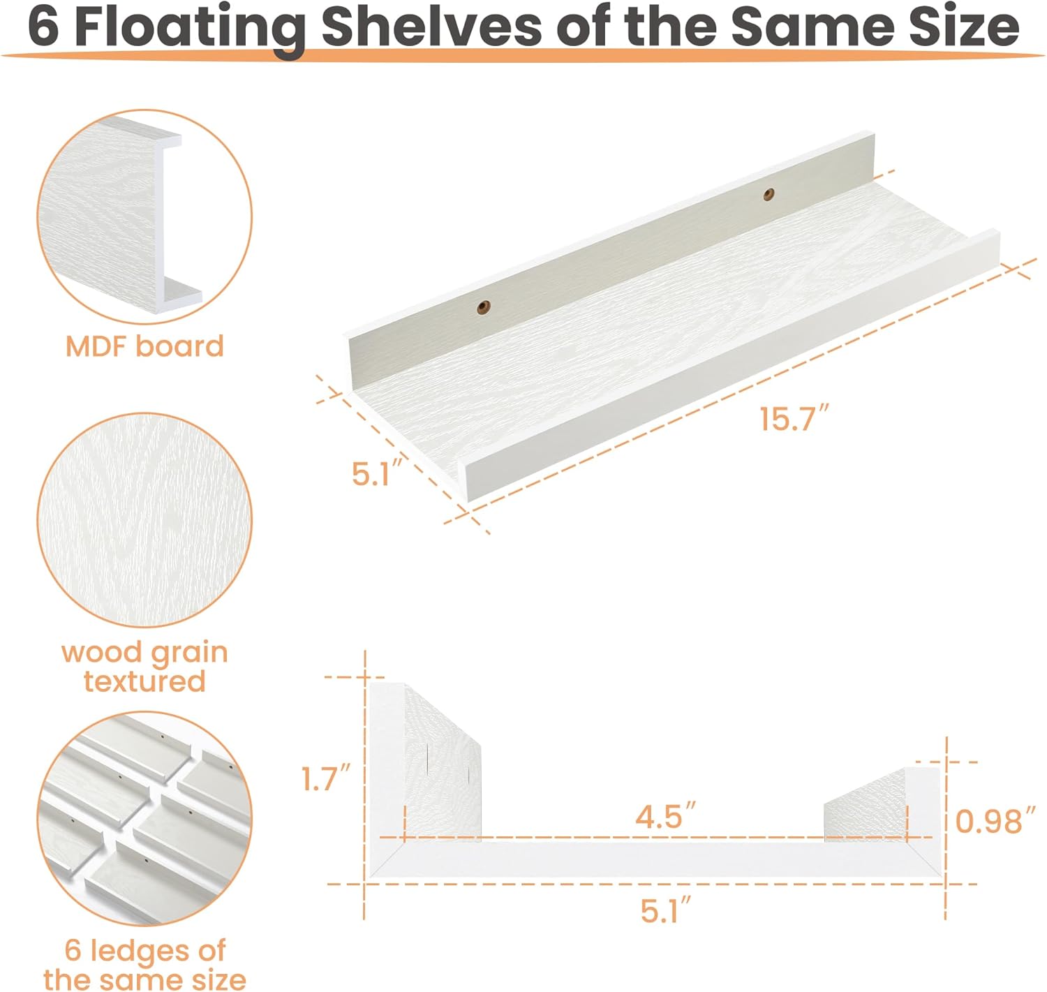 upsimples Floating Shelves for Wall, Wall Shelves for Decor Storage Set of 6, Wall Mounted Wood Shelf for Bedroom, Living Room, Bathroom, Kitchen, Picture Ledge Shelf, White