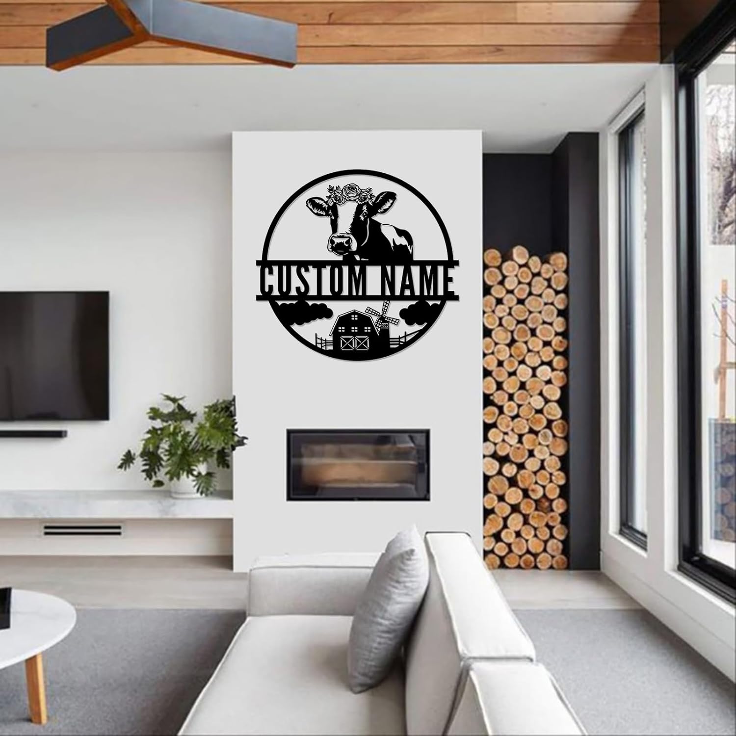Custom Cow Metal Sign, Personalized Family Name Wall Art, Farmhouse Customized Gifts for Farmer, Flower Monogram Decor for Living Room Indoor Outdoor Hanging