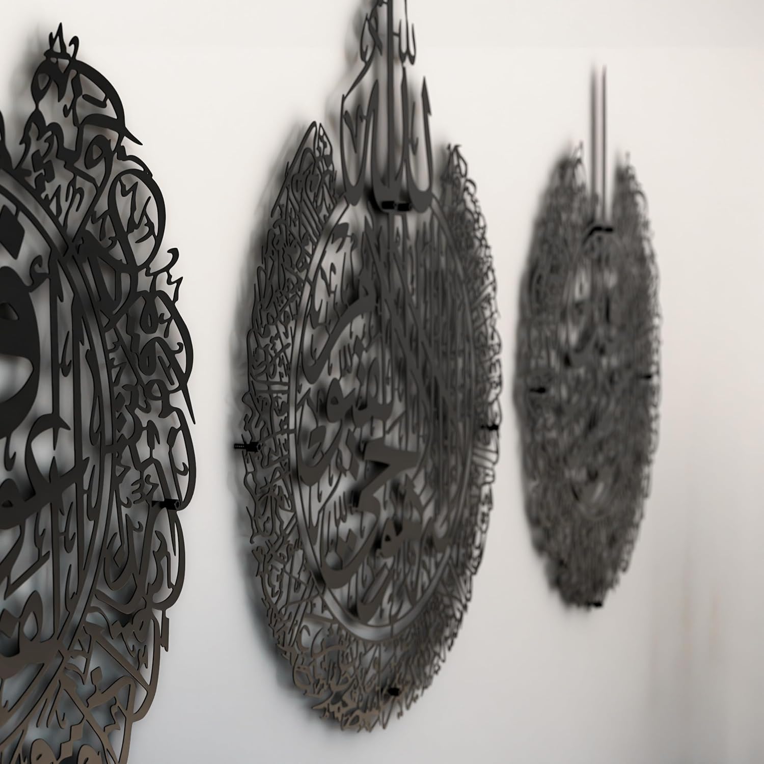 iwa concept Set of 3 Ayatul Kursi, Surah Al Falaq, Surah an NAS Islamic Metal Wall Art, Quran Wall Art, Arabic Calligraphy, Pray Room Decorations (M, Black)