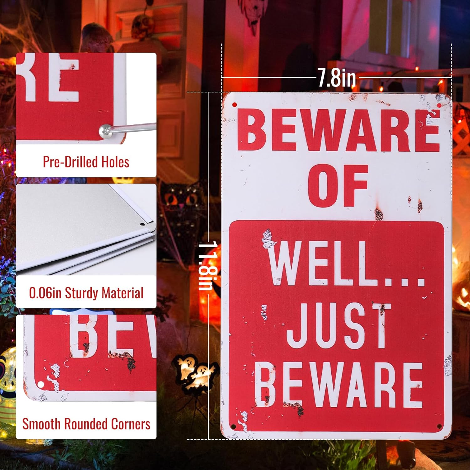 - High Quality: "Beware of Well Just Beware" sign made of durable rust free aluminum. Features waterproof, dustproof construction and fade-resistant UV printing;suitable for indoor and outdoor Halloween home decor