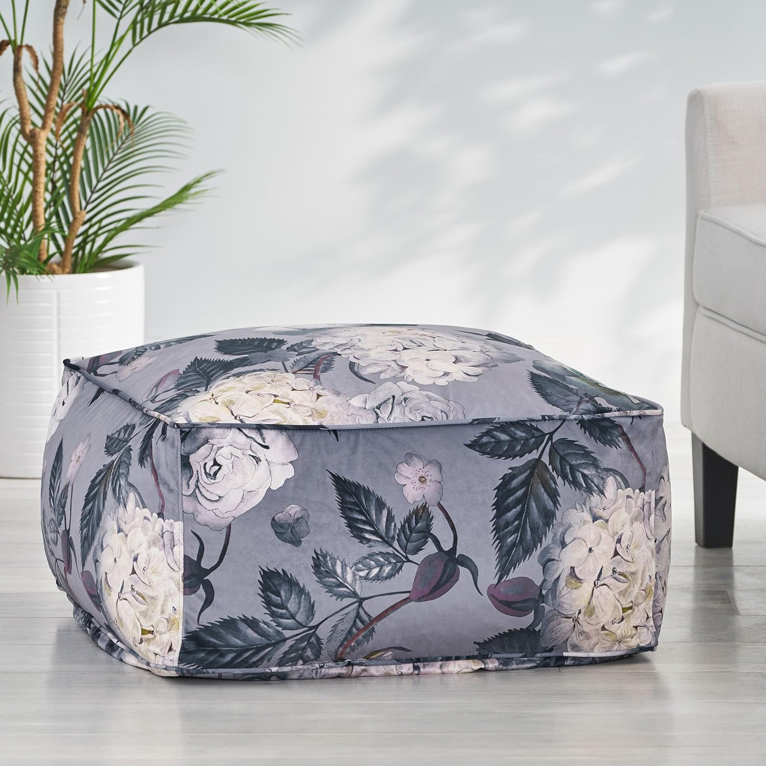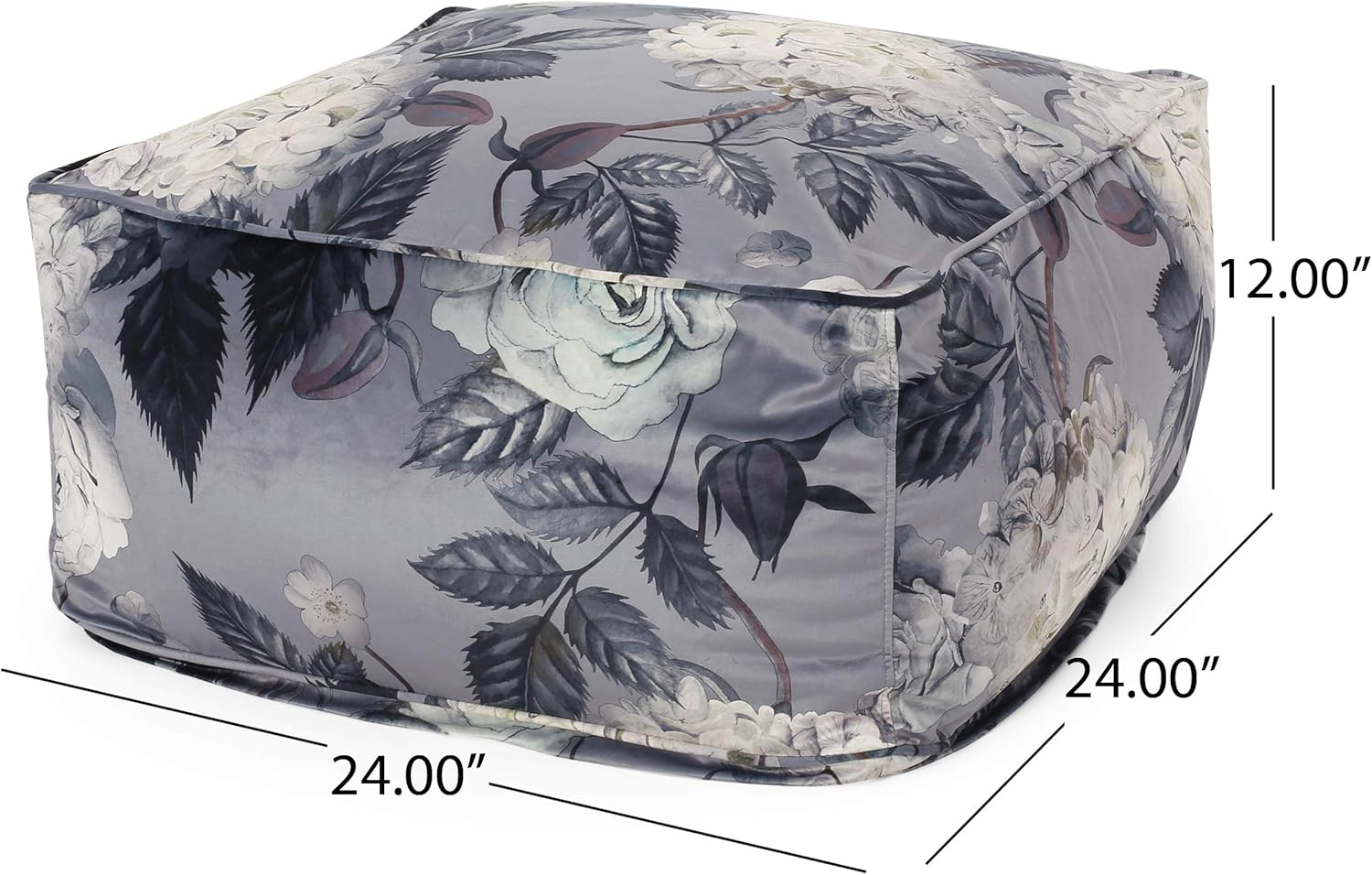 GDFStudio Traditional Velvet Flower Print Cube Pouf Ottoman Foot Stool - Bean Bag Floor Chair - Foot Rest Couch for Living Room Bedroom,Large Flower Print on Gray,24"" x 24"" x 12"", 314502N