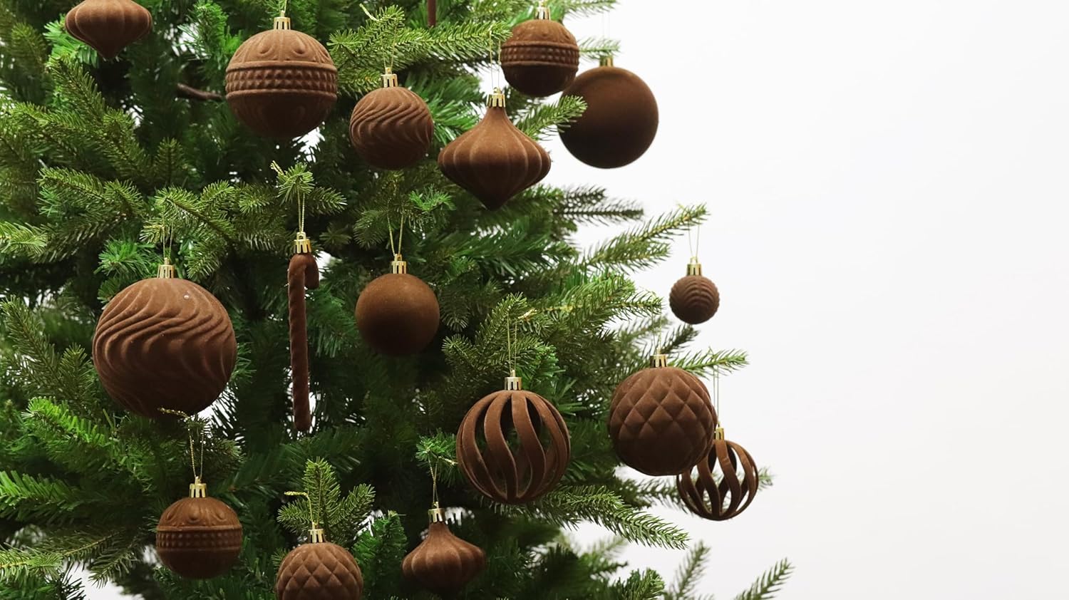 - Package List: the package contains 63pcs of flocked Christmas ball ornaments, measuring approx 3.94/3.15/2.36/1.57/inches in diameter, brown colors,not only classic styles,but also innovative styles,including five shapes and nice texture can fully meet your needs for decorating