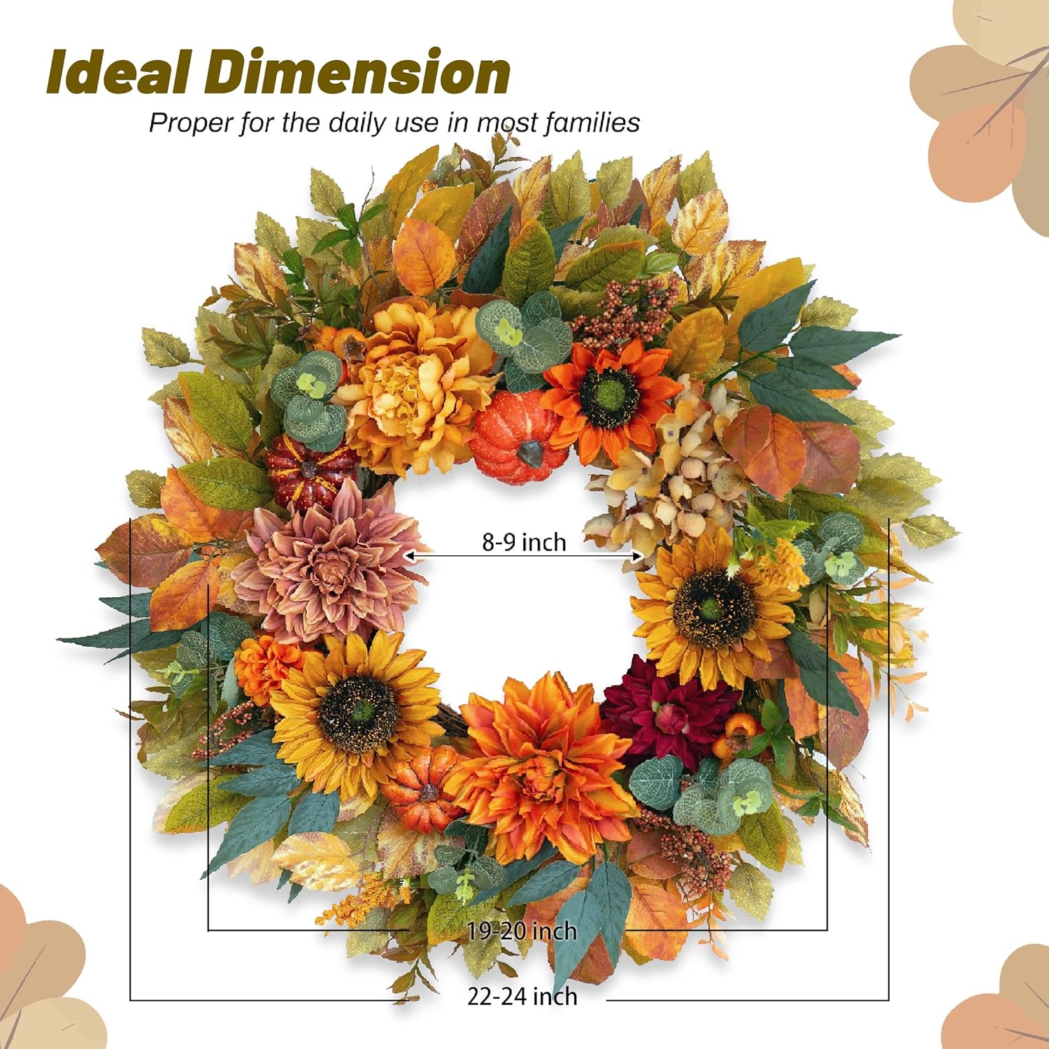 Fall Wreaths for Front Door 24 Inch Autumn Wreath with Sunflowers, Pumpkins Dahlia & Maple Leaves Outdoor Fall Wreath for Thanksgiving, Harvest, Halloween Home Décor