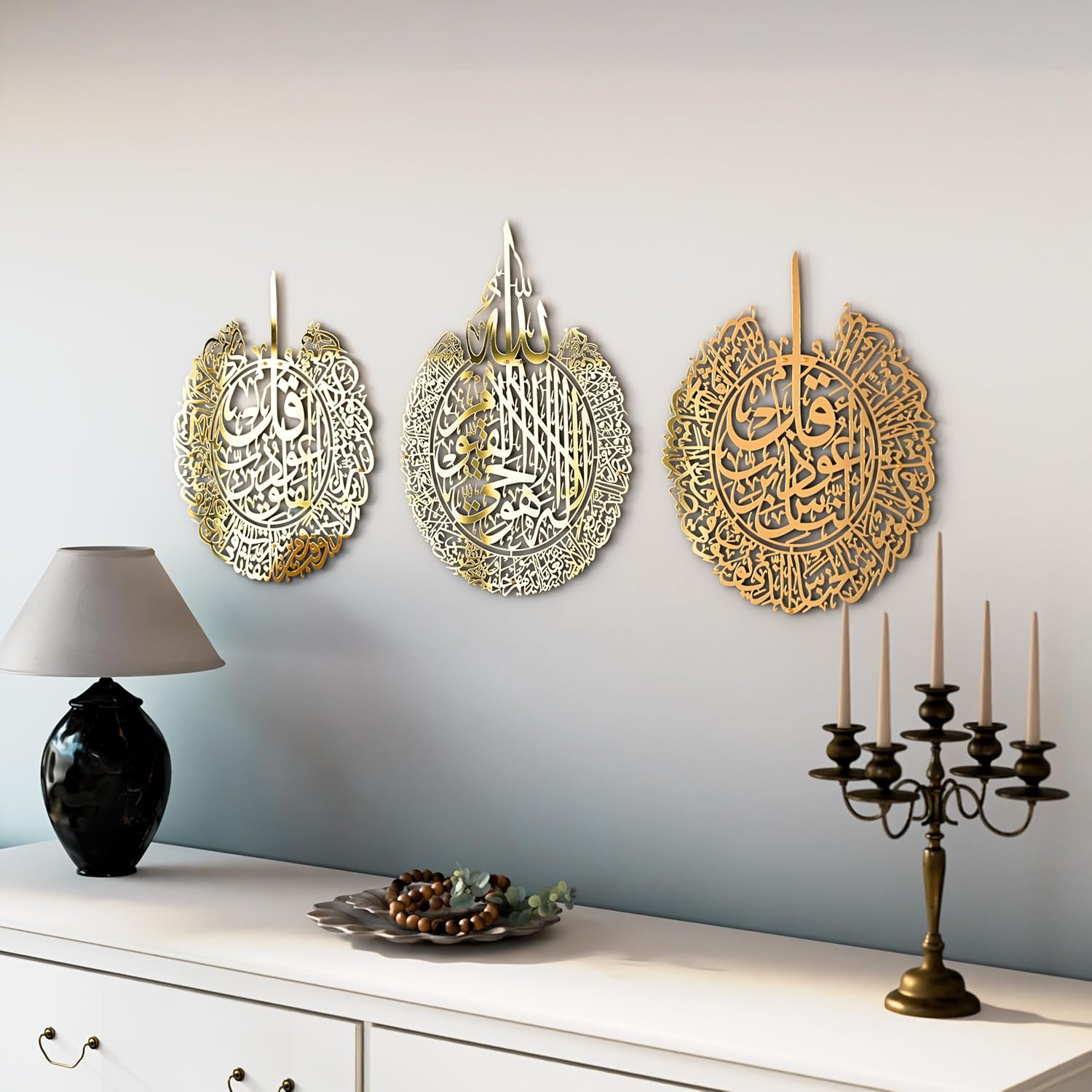 iwa concept Set of 3 Ayatul Kursi, Surah Al Falaq, Surah An Nas Islamic Metal Wall Art, Quran Wall Art, Arabic Calligraphy, Pray Room Decorations (M, Shiny Gold)