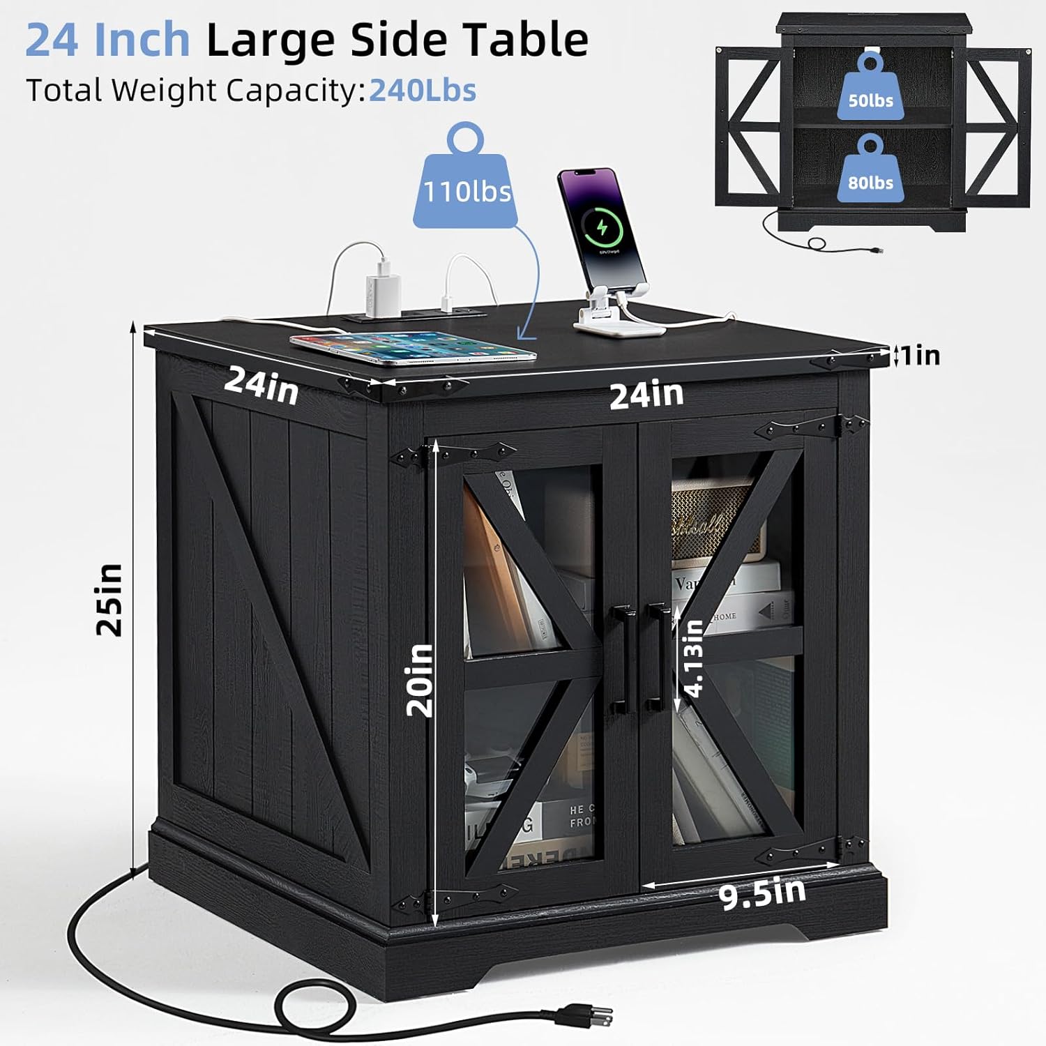 - 🏡[Farmhouse-Style end Table with Charging Station]This large end tables with generous storage is a perfect fusion of farmhouse and industrial metal styles. The exquisite barn-style tempered glass doors and the black metal corner accents add an elegant touch to the cabinet body, making it visually captivating from any angle.