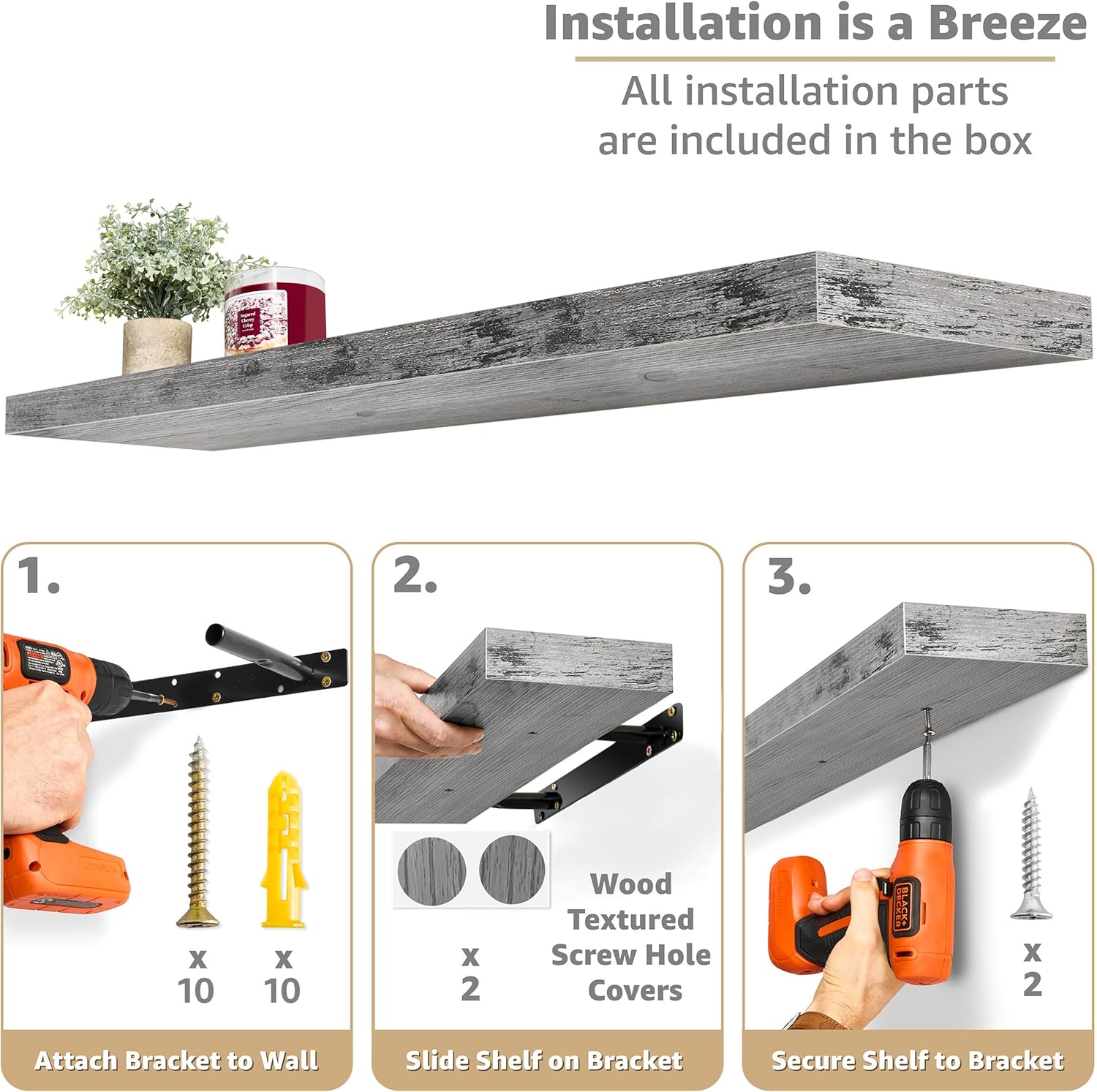 - Easy to Install: Minor assembly required, detailed instructions included. Hanging shelves are made of beautiful, engineered faux wood (not solid wood) with a smooth matte finish. Enhanced steel brackets attach firmly to the wall. Sturdy enough to hold up to 22 lbs. Mounting hardware INCLUDED. Color of bathroom shelf may be slightly different from the product photos due to lighting and screen settings