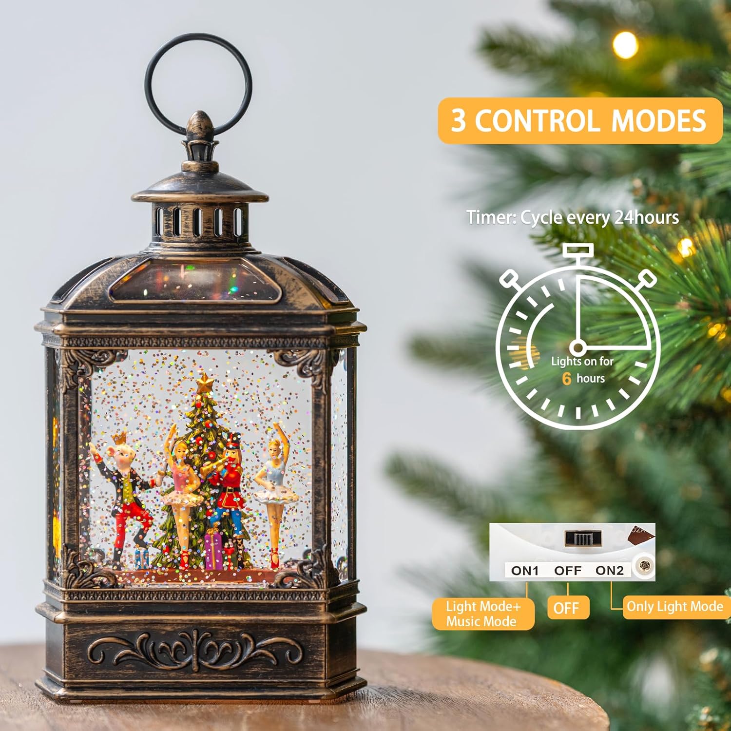 Christmas Snow Globe Lantern Water Glittering Nutcracker Ballet Stage with Music & Timer, USB Lined/Battery Operated Lighted Lantern for Christmas Festival Decoration Gifts