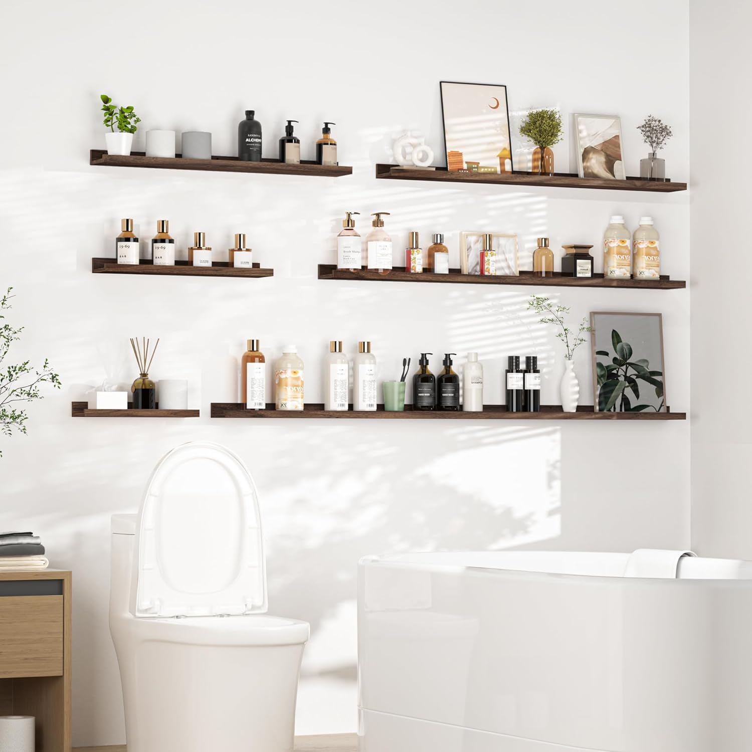 - Picture ledge Shelf for Walls: If you have dozens of pictures but don't know how to display them, Heimlove picture ledge shelves(especially large size) for walls are perfect! With our hanging shelves, store and display different types and sizes of photo frames in one place. The ledge in front of the wall shelves could prevent your precious items from falling off.